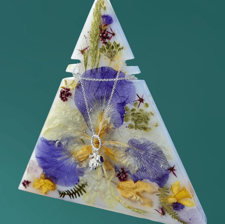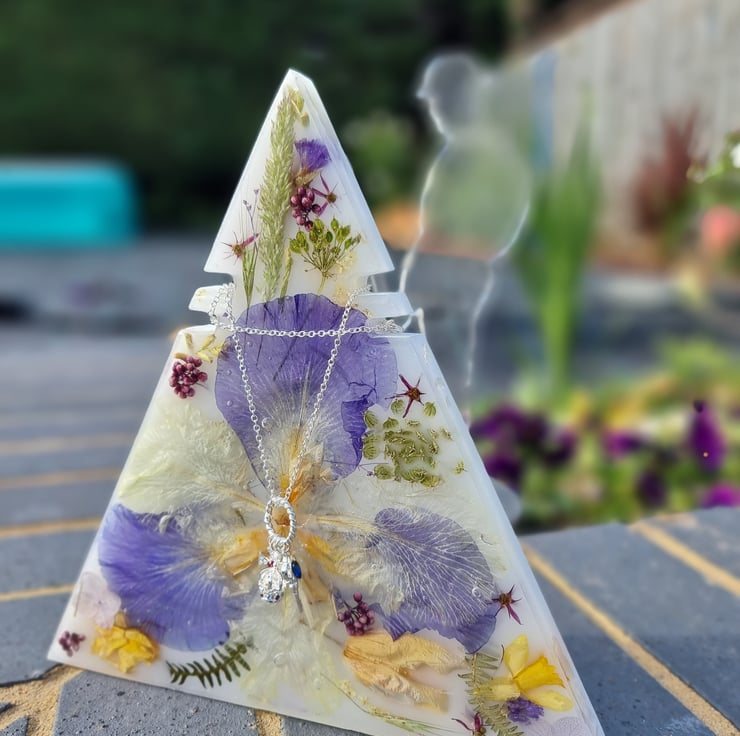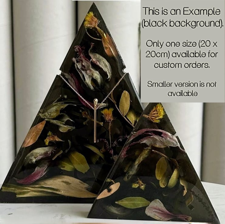 Elevate your jewelry organisation with this handcrafted resin triangle stand, beautifully embedded with real preserved flowers. Designed not only to store but also to display favourite necklaces and chains, this unique piece features two precision-cut slots on each side to secure your jewelry in place.