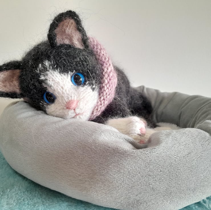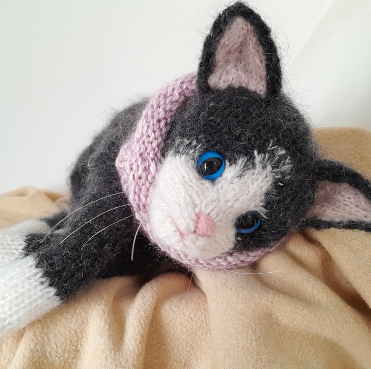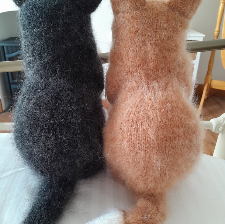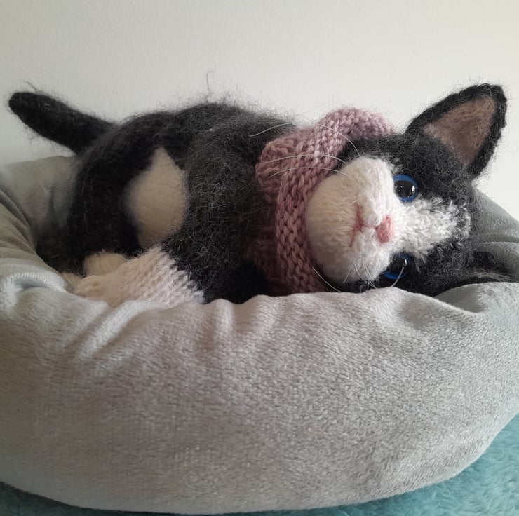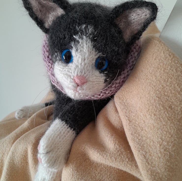 This tuxedo boy is knitted in a very soft brushed alpaca yarn and with some hand brushing makes him extremely soft. He is filled with as heavy fibre to give him some weight in his bootie and a light as a feather stuffing for some movement in his upper half and legs.