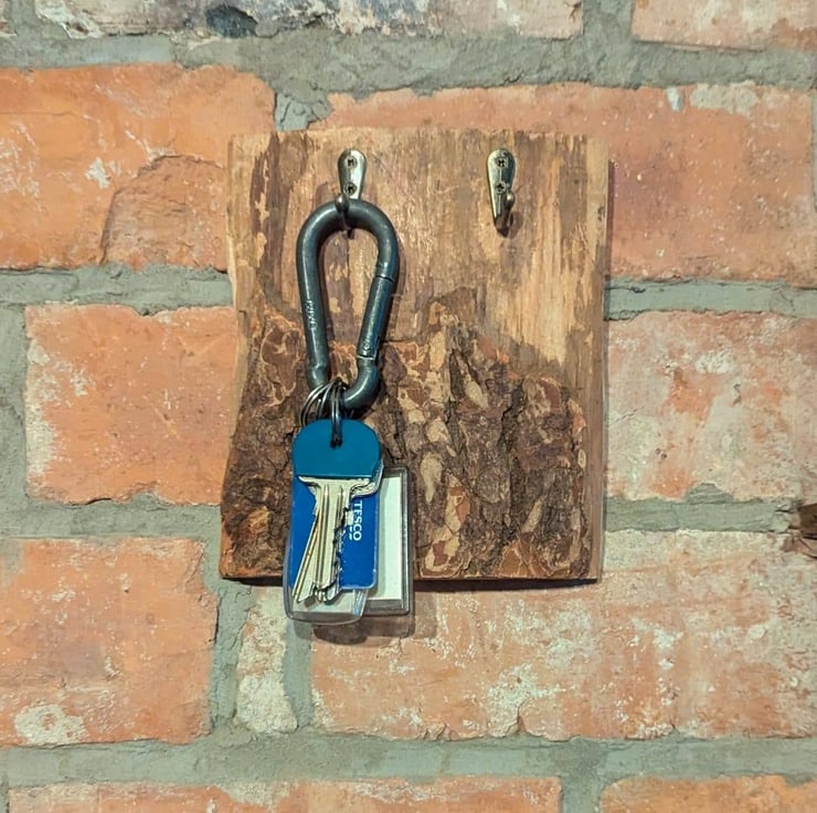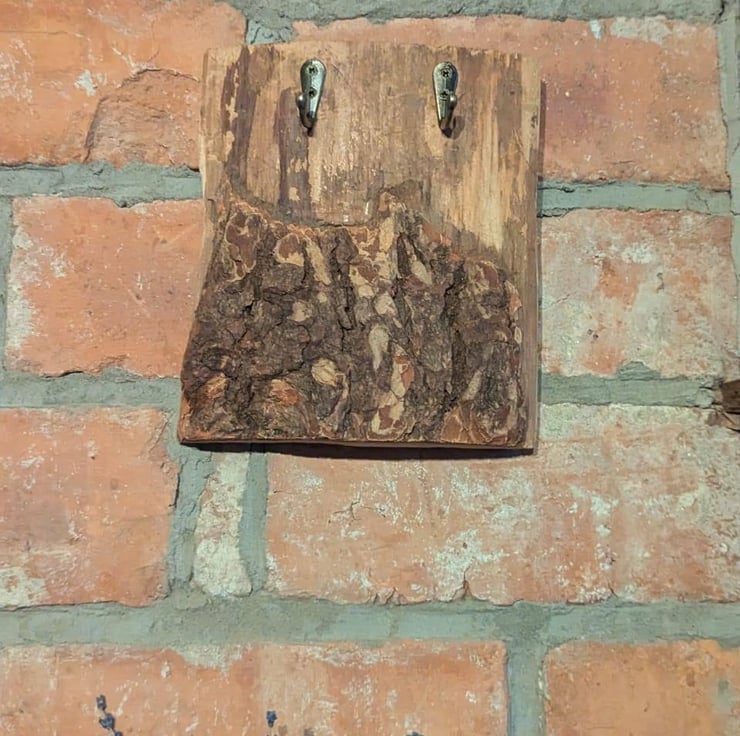 2 hook key rack. Made from reclaimed wood with natural bark. Attachments on the back for wall hanging. Will hold 2 sets of keys.