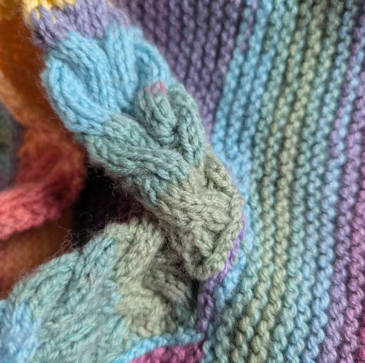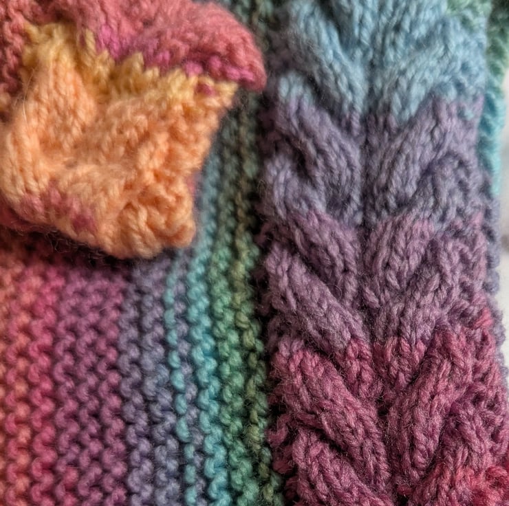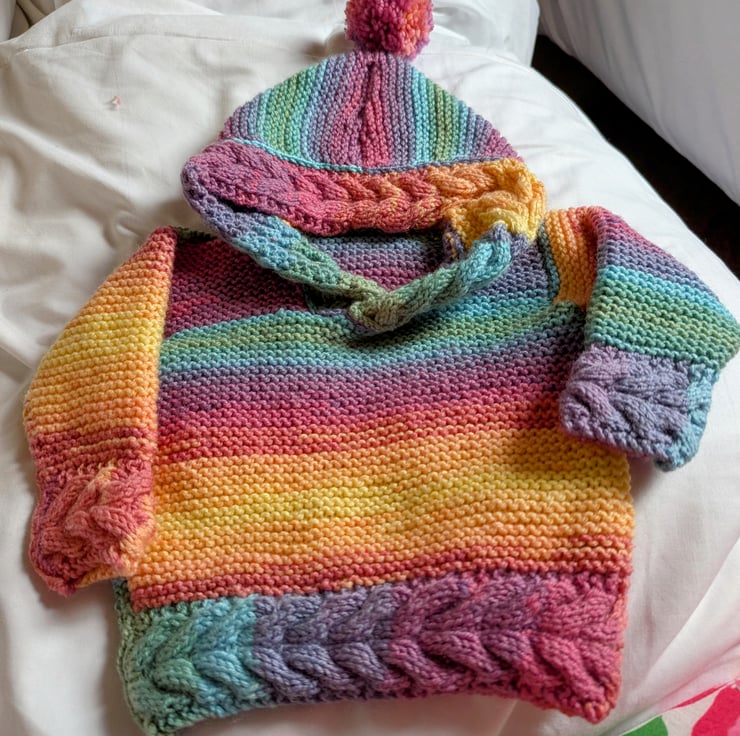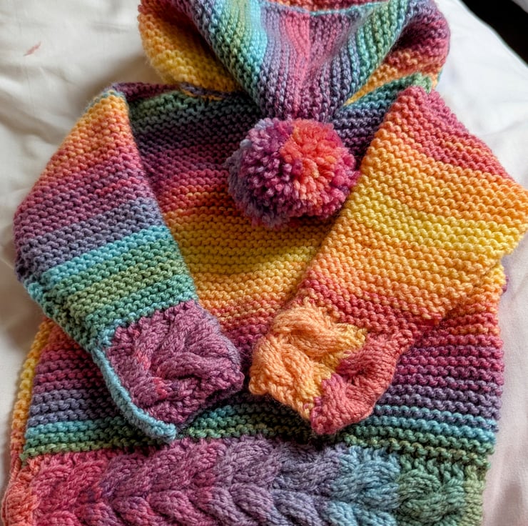 All things bright and beautiful, this baby boy jumper in an unusual pattern, with decorative welts on the sleeves and around the bottom edges. It is knitted in a self patterning wool that makes it original and catchy. Topped off by a cute hood and pom-pom. Using Hayfield Spirit DK, it is machine washable on wool cycle but not tumble dryable.