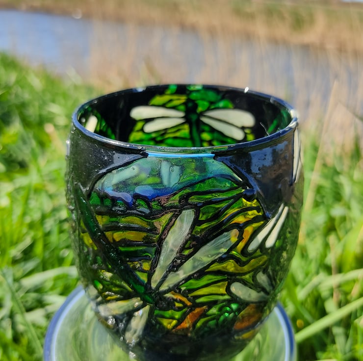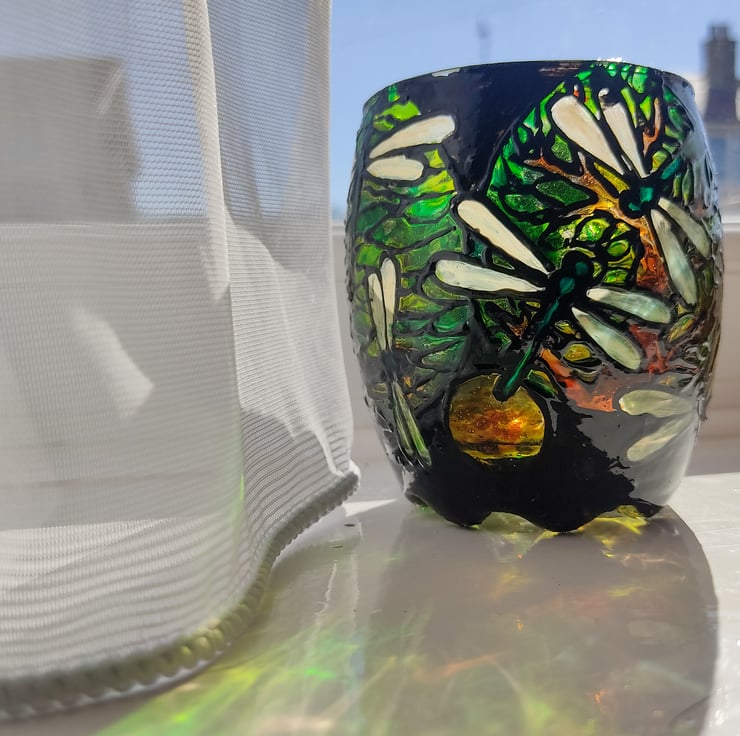 The candleholder is made of stained glass effect painted glass tumbler covered with layer of transparent varnish for protection. It depicts four circular vignettes with transparent forest green dragonflies and black opaque background in between. The vignettes show green layered fields, ab abstract army masking-colour-like pattern, an in between tree crown view and green leaves.