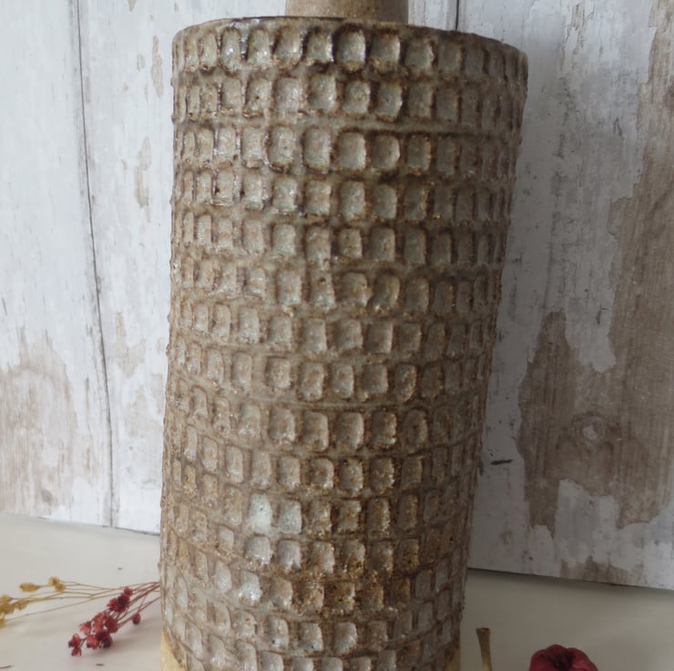 Cylindrical bottle vase hand built from textured, buff coloured grogged clay that has been carved for added texture and interest. Fired to stoneware temperature (1280C) with a satin white glaze over a darker reactive slip. Would suit dried flowers, but will hold water.