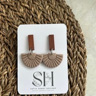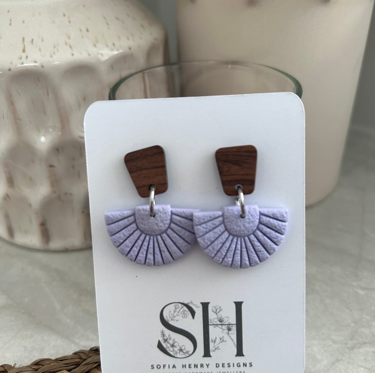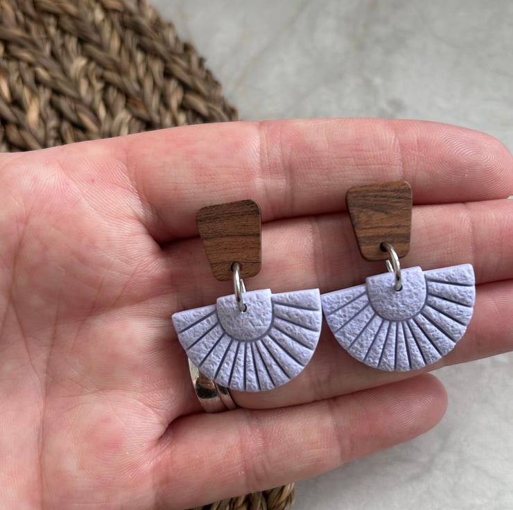 Add a subtle pop of pastel charm to your accessory game with these handcrafted lavender fan earrings. Made from textured polymer clay and paired with a rich walnut wood geometric stud top, these earrings blend modern design with natural elegance. Their soft lavender hue and fan-like shape make them a beautiful statement piece for both casual and dressy outfits. Lightweight and hypoallergenic – perfect for all-day comfort.