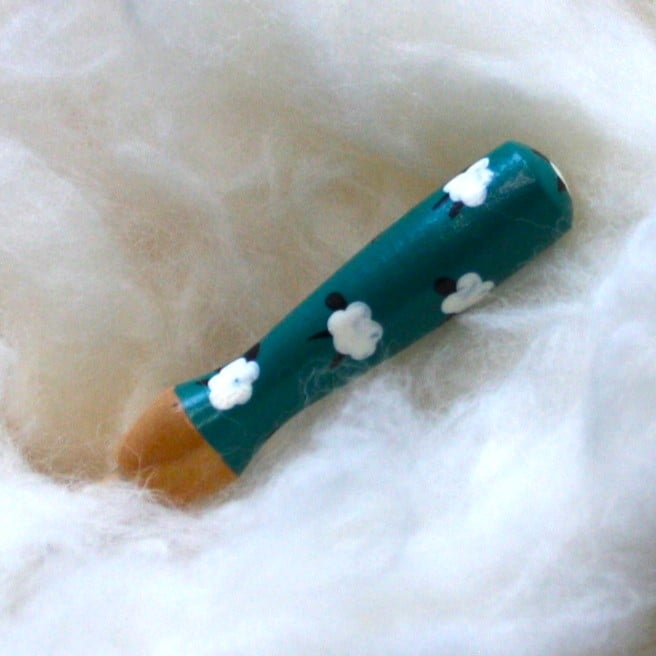 Hand painted, wooden needle grip holder for use with needle felting needles, jade green with little white sheep. A perfect gift for your felting friends or as a treat for yourself.