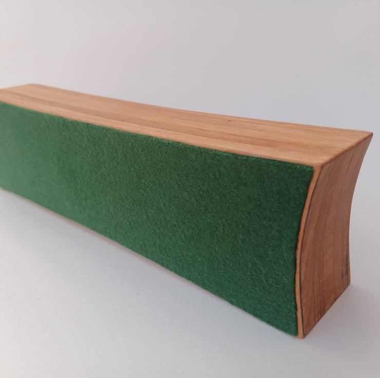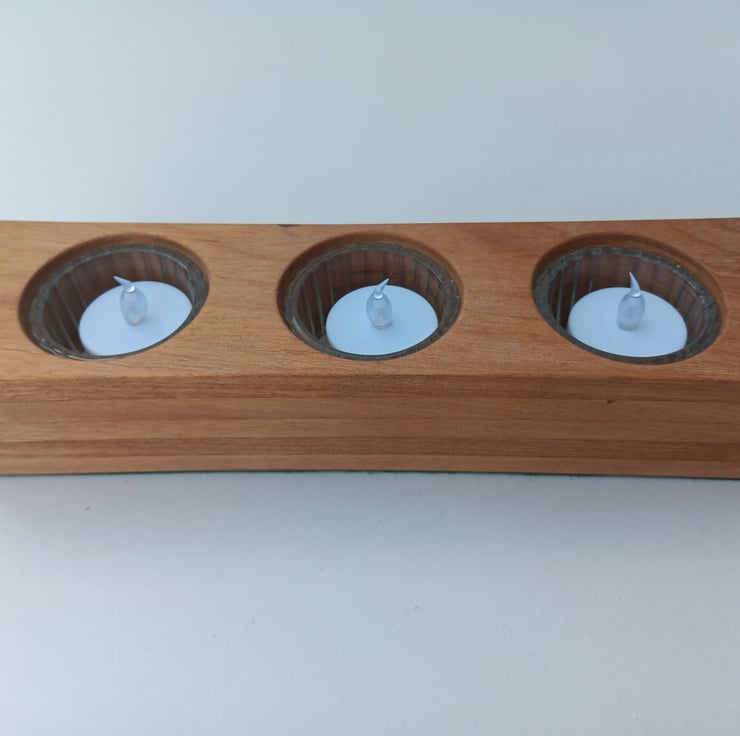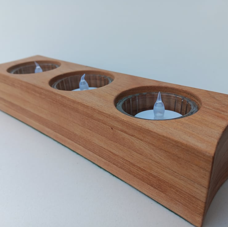 This triple candle holder is made from recycled Asian hardwood, finished in oil and polished. the underside is covered in dark green felt. The pictures taken are with battery candles and it can also take the wax type candles. Included in this sale is 3 glass candle holders, 3 warm light battery candles with battery's and 3 t-lite wax candles. The battery type is CR2032.