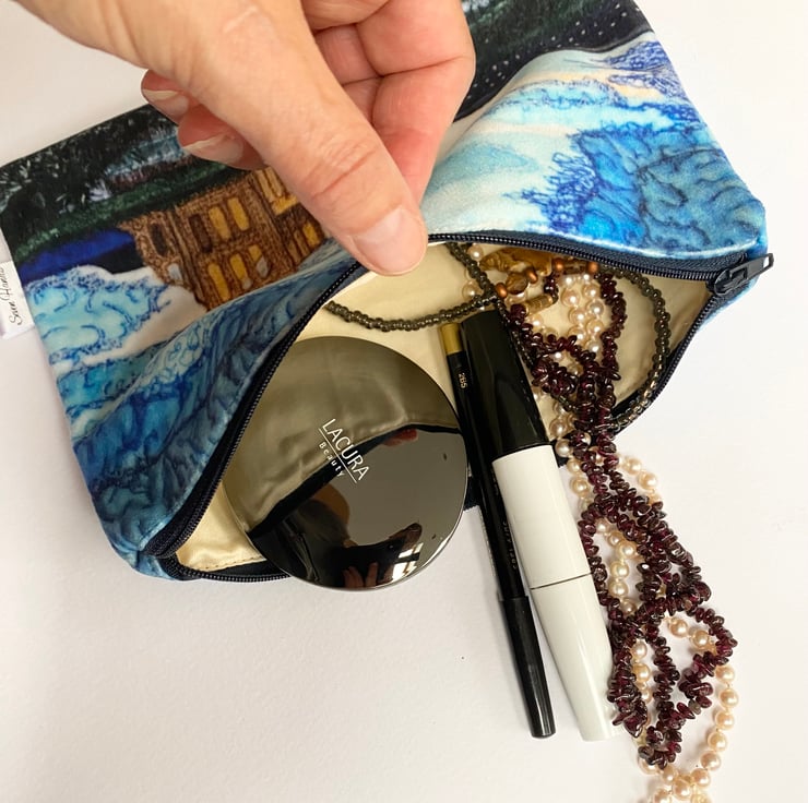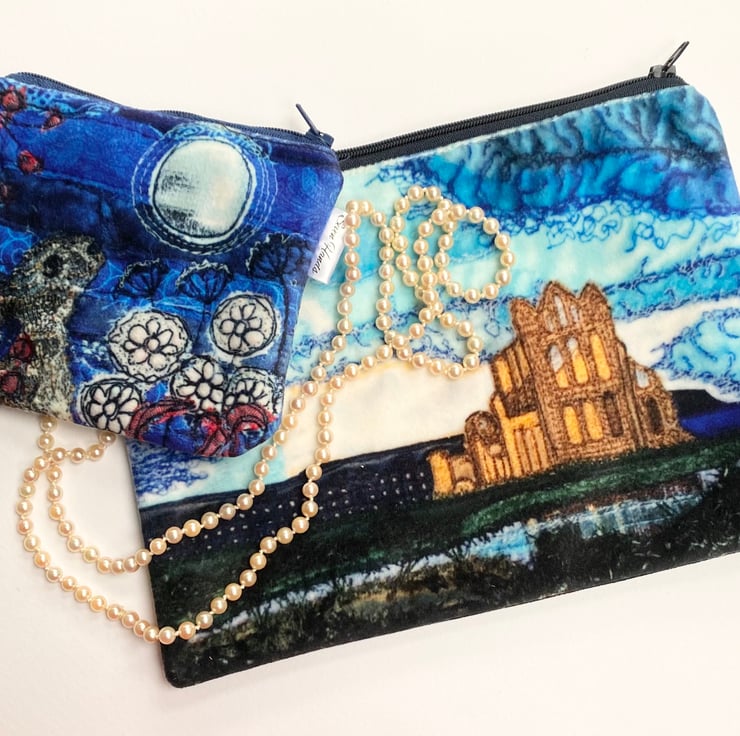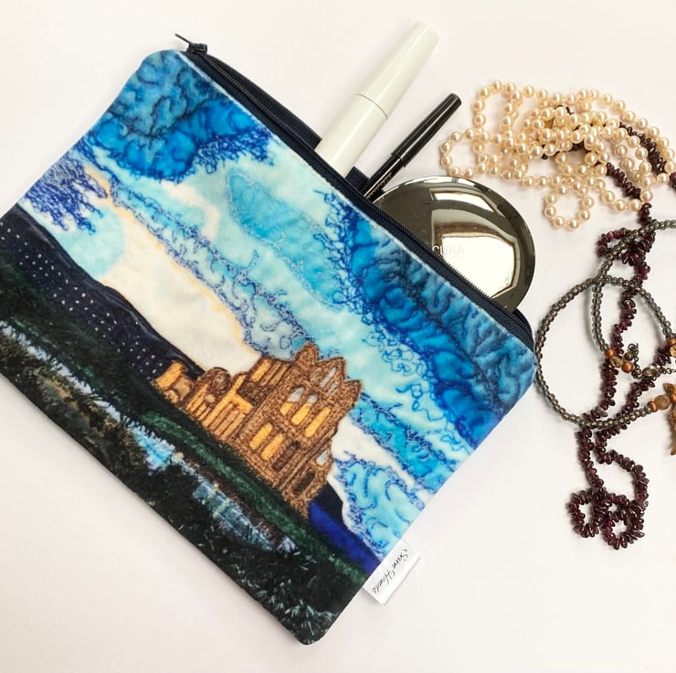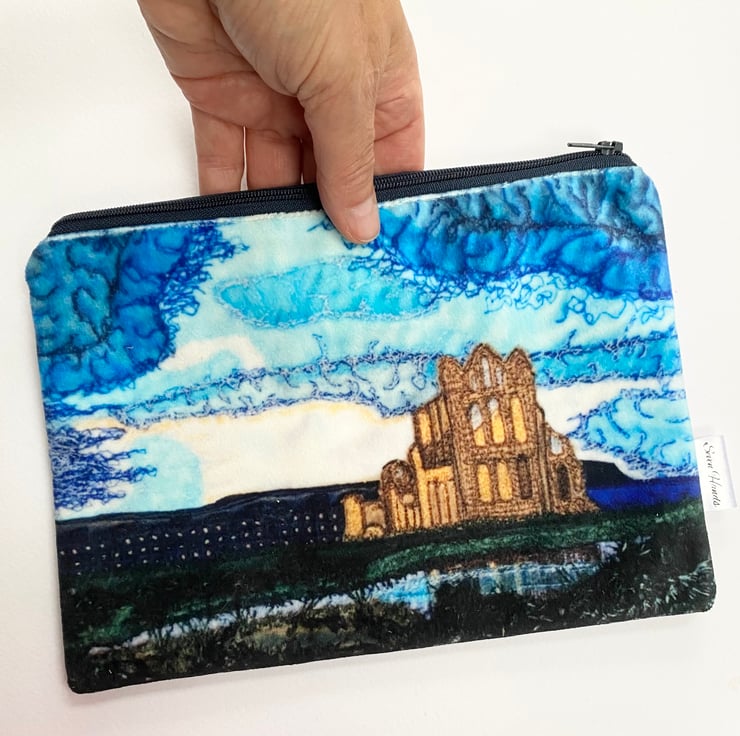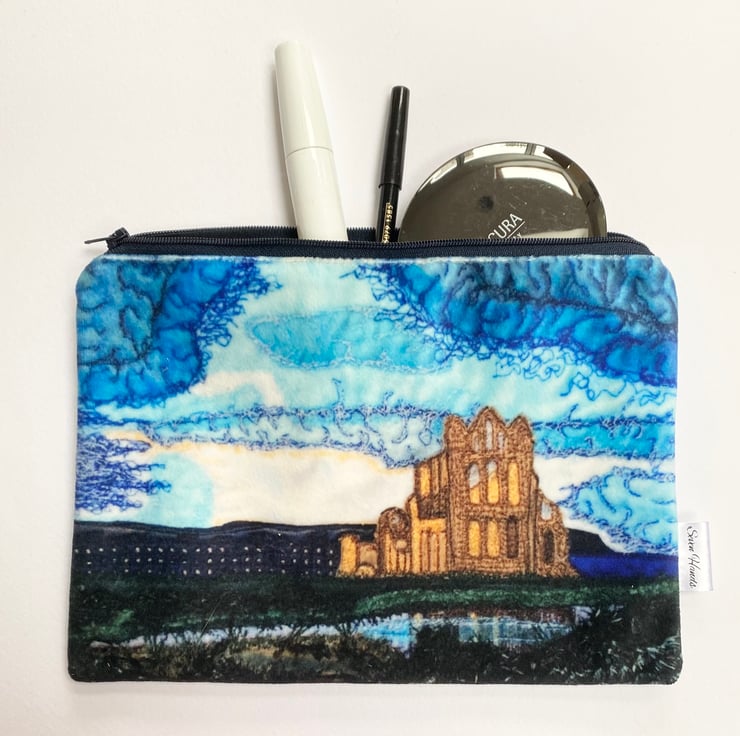 This highly versatile gorgeous zip bag is decorated with a print of one of my embroidered landscapes of Yorkshire. It shows Whitby Abbey over the pond. It’s lined inside with an blue water proof lining, and has a matching blue coloured zip. The print is on the front and back.