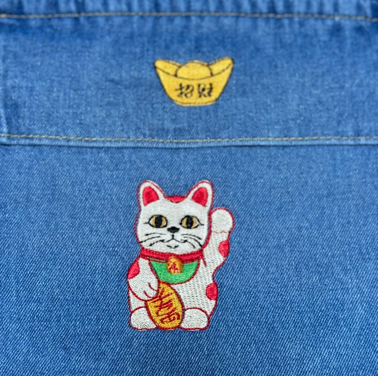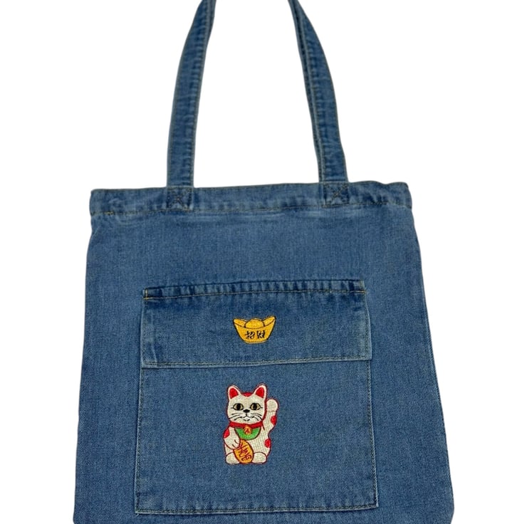 Stylish and sturdy denim canvas tote featuring a charming embroidered lucky cat on the front pocket. Clean lines and a secure zipper opening keep your items safe, while an internal pocket helps organize essentials. A versatile everyday bag that pairs durability with playful, artisanal detail.
