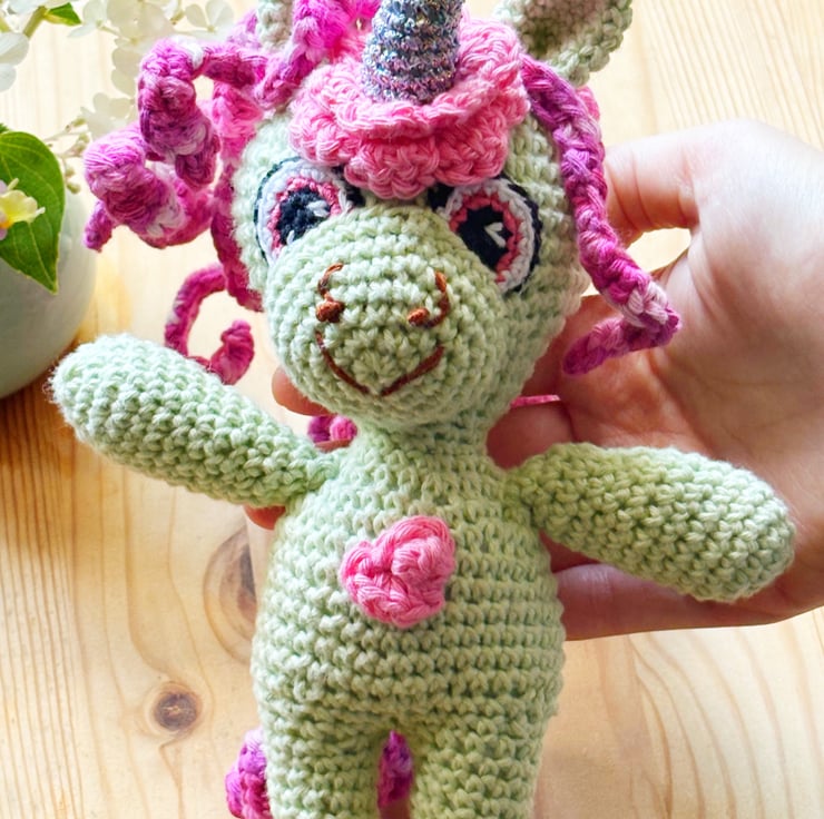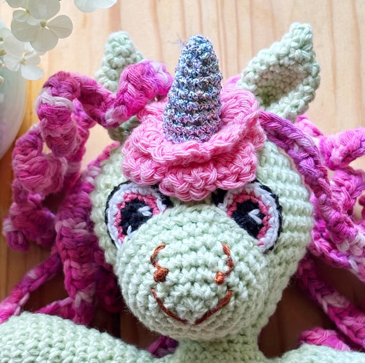This unicorn was designed and made me, inspired by Swedish princess cake, it is made in 100% cotton yarn and can be gently hand washed and air dried