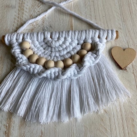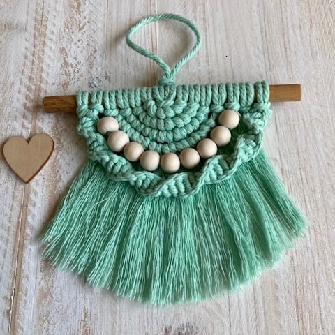 Add a touch of boho style to any room with these beautiful natural mini macrame wall hangings. Semi-circle design with added wooden beads on a wooden dowel. Handmade with love in the United Kingdom, these small wall hangings measure approx 11cm in height and 13cm in width, making them the perfect size for any space. The cotton material and ready-to-hang feature make them easy to display and the Scandi design is sure to impress. Ideal as a decoration or gift, these wall hangings are a must-have for anyone who loves unique and handmade home decor. The macramé pattern and boho theme make them a standout piece that will add a touch of personality to any room. Whether you're looking to spruce up your living space or add a touch of charm to your bedroom, these wall hangings are the perfect choice.
