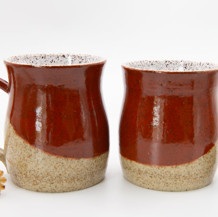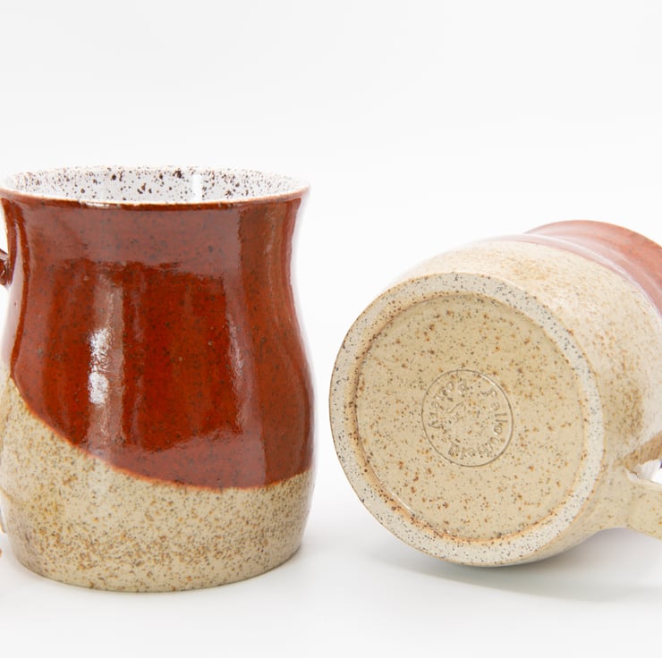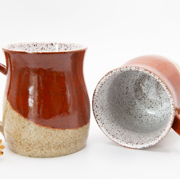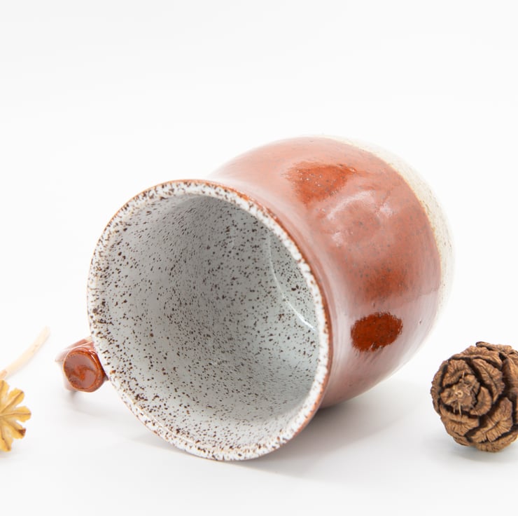 Made from chocolate speckled clay and finished with a white gloss liner and outside a combination Sienna Speckled and Gloss Clear glaze.