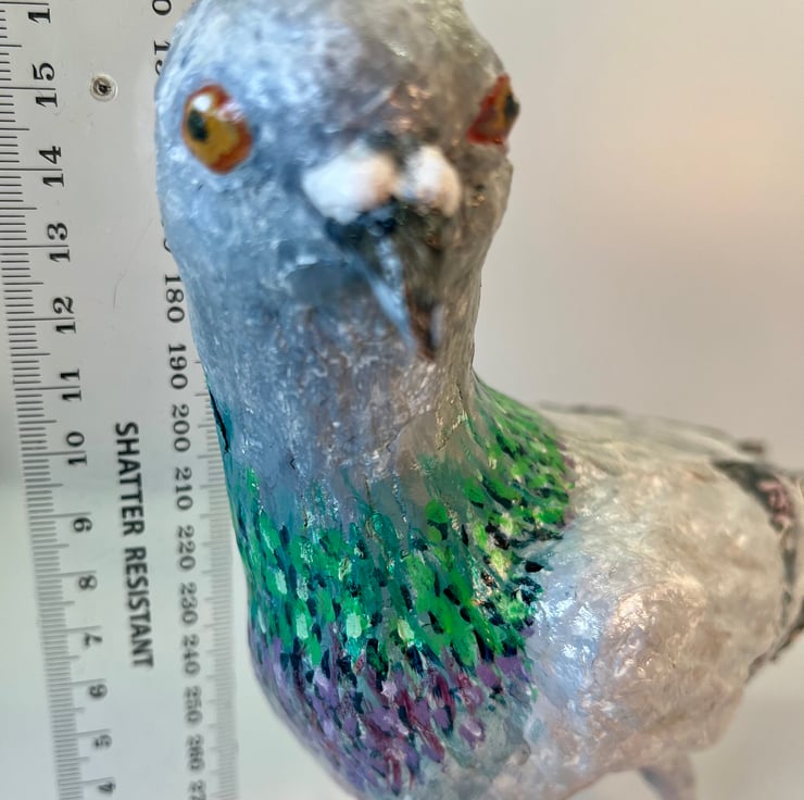 Roughly life-sized, the pigeon stand at approximately 17cm tall and is approximately 25cm from head to tail.