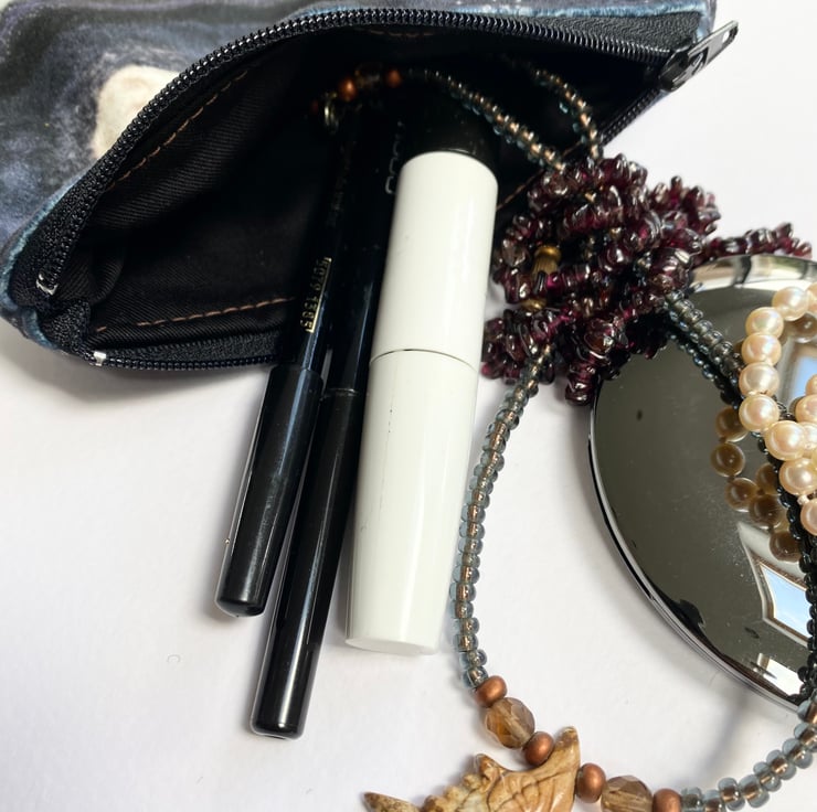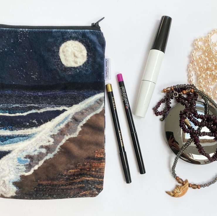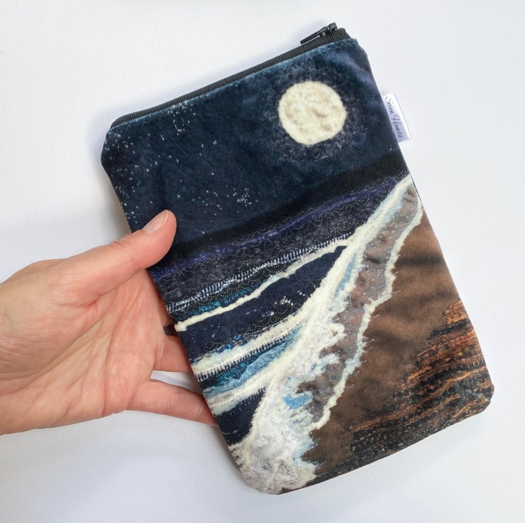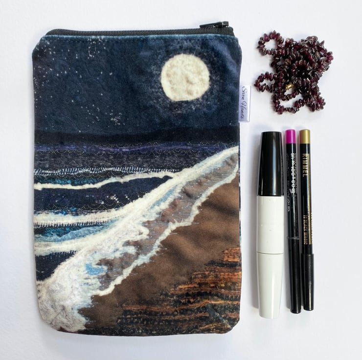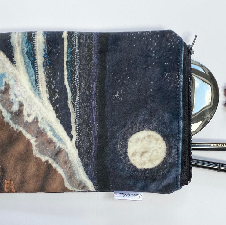 This highly versatile luxurious zip bag is decorated with a print of one of my collage seascapes. This one shows a full moon over a beach. It’s lined inside and has a matching coloured zip. The print is on the front and back.