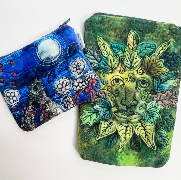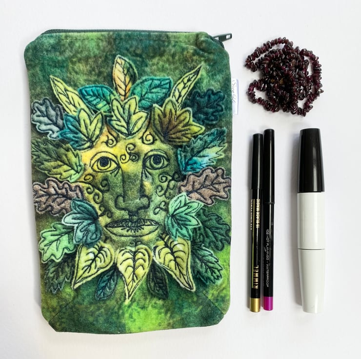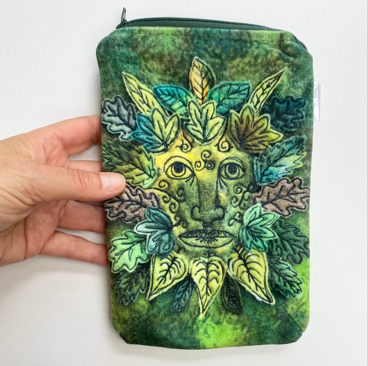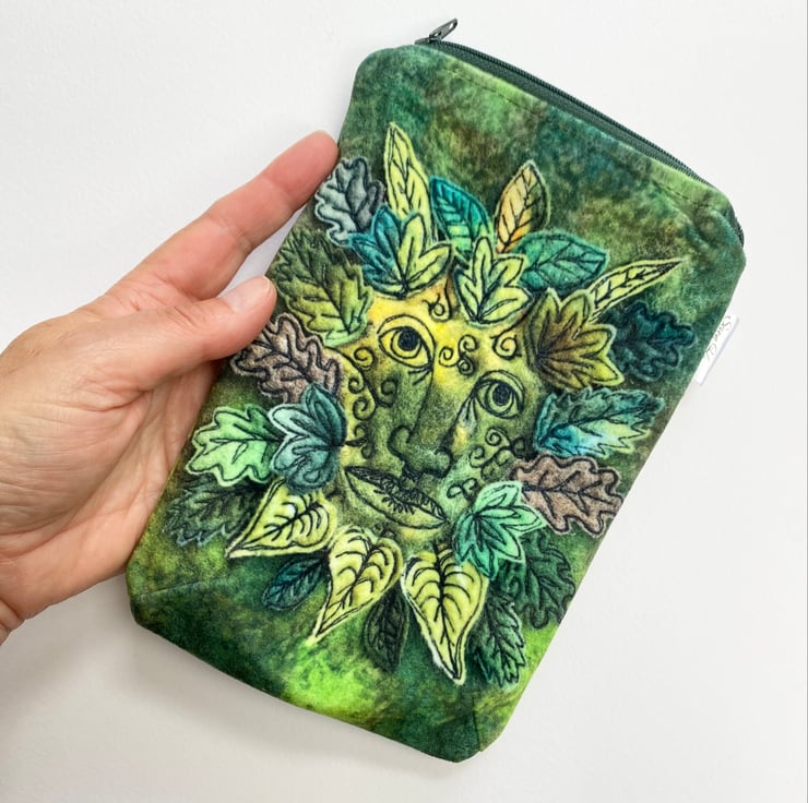 This highly versatile luxurious zip bag is decorated with a print of one of my wet felted pieces. This one shows the Green Man. It’s lined inside and has a matching coloured zip. The print is on the front and back.