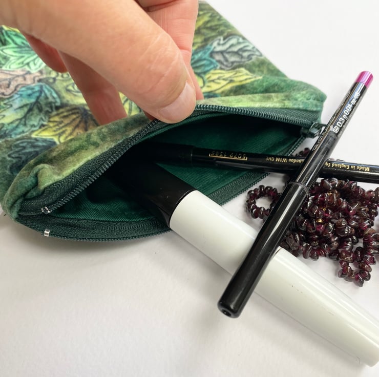 The bag measures 22 x 14 x 0.5cm approx. The zip opening width is 11cm. All pouches are handmade and made of velvet.