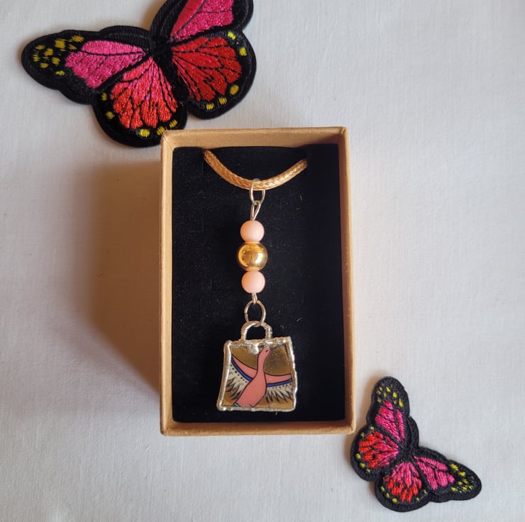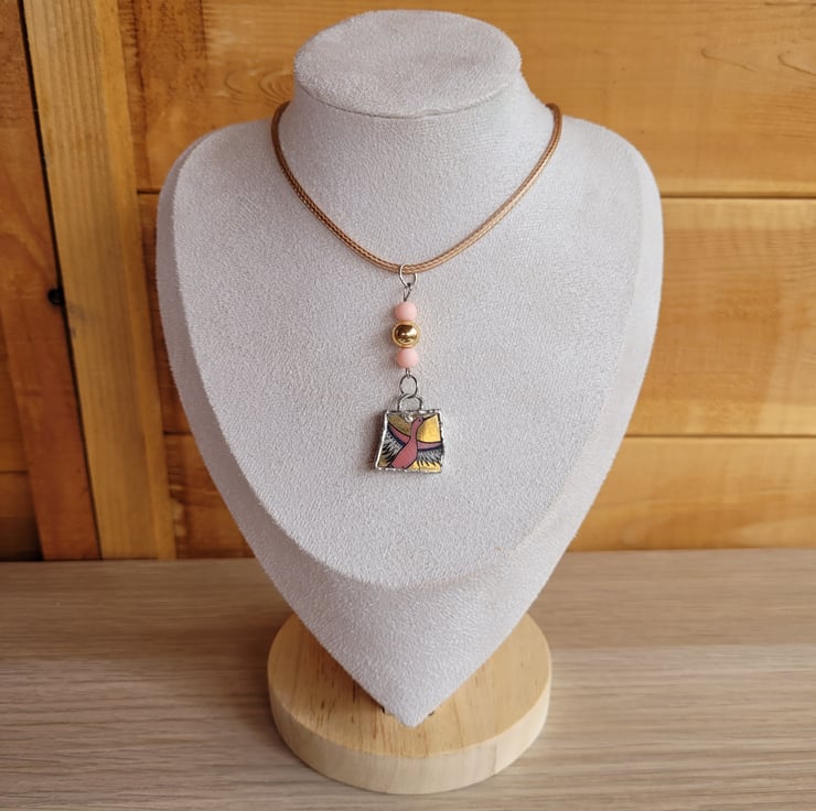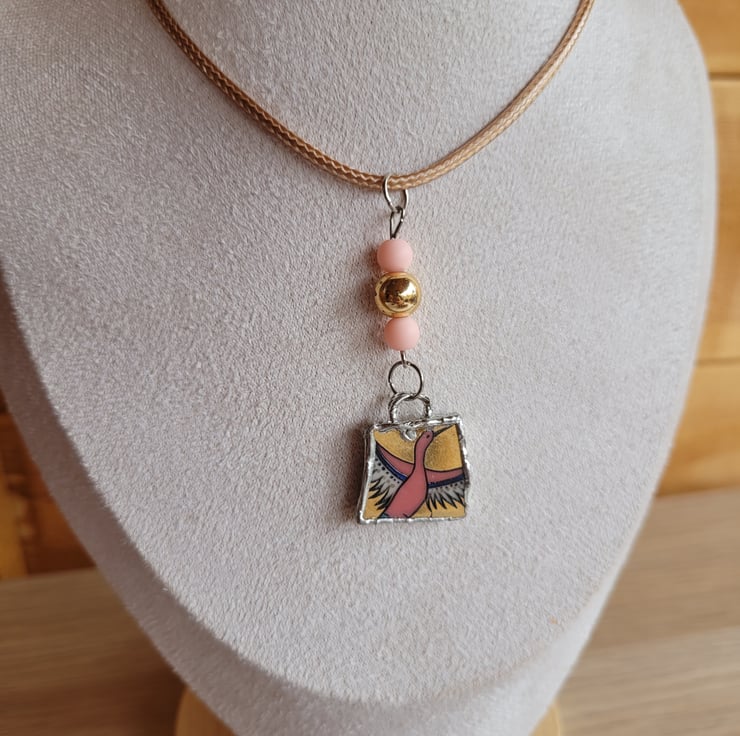 Upcycled Egyptian Peach Bird Ceramic Plate Necklace with Brown Cord.