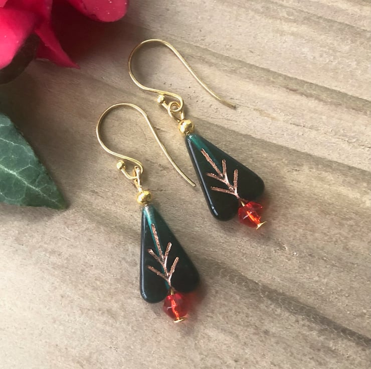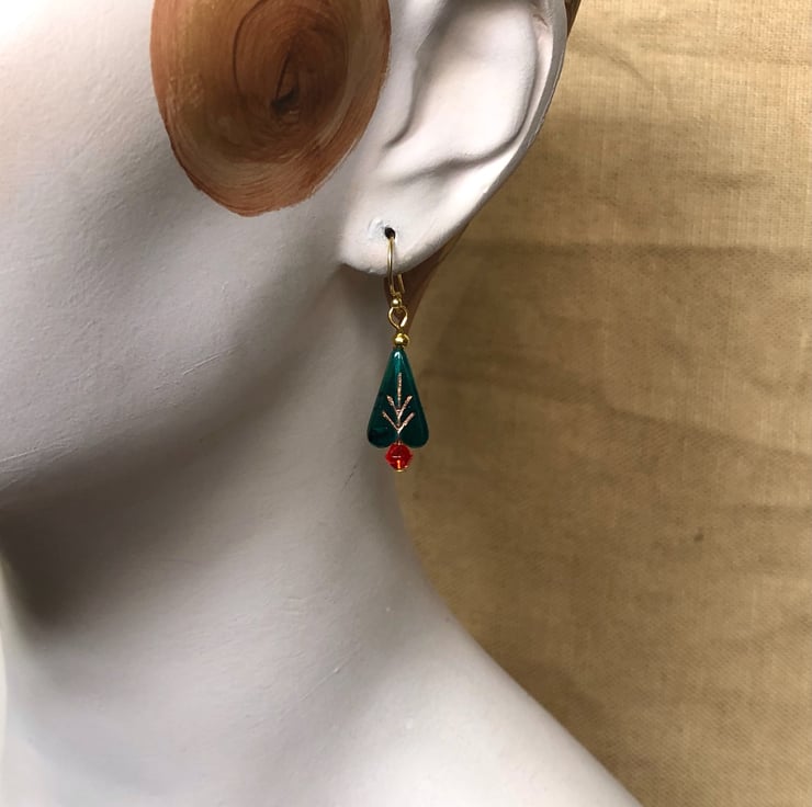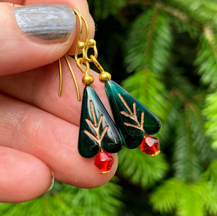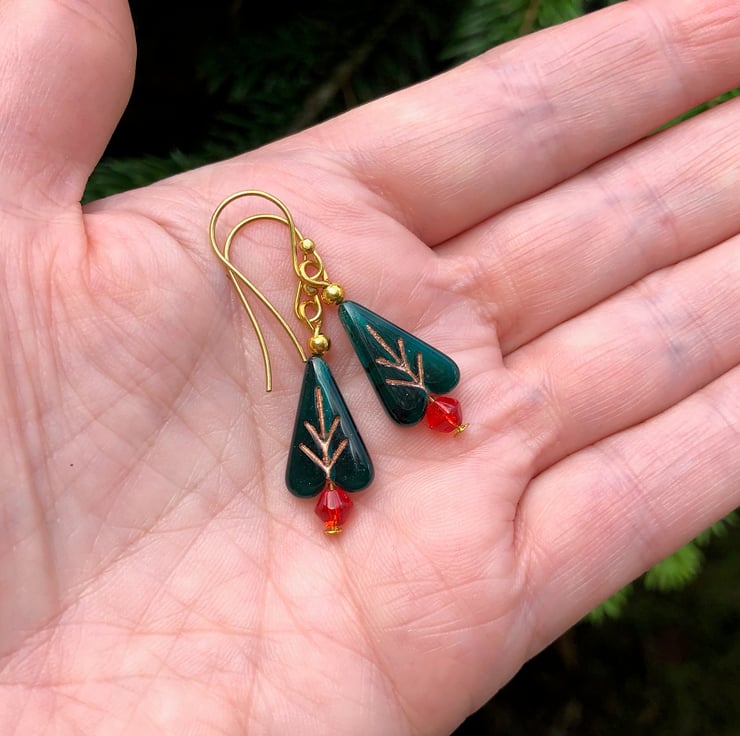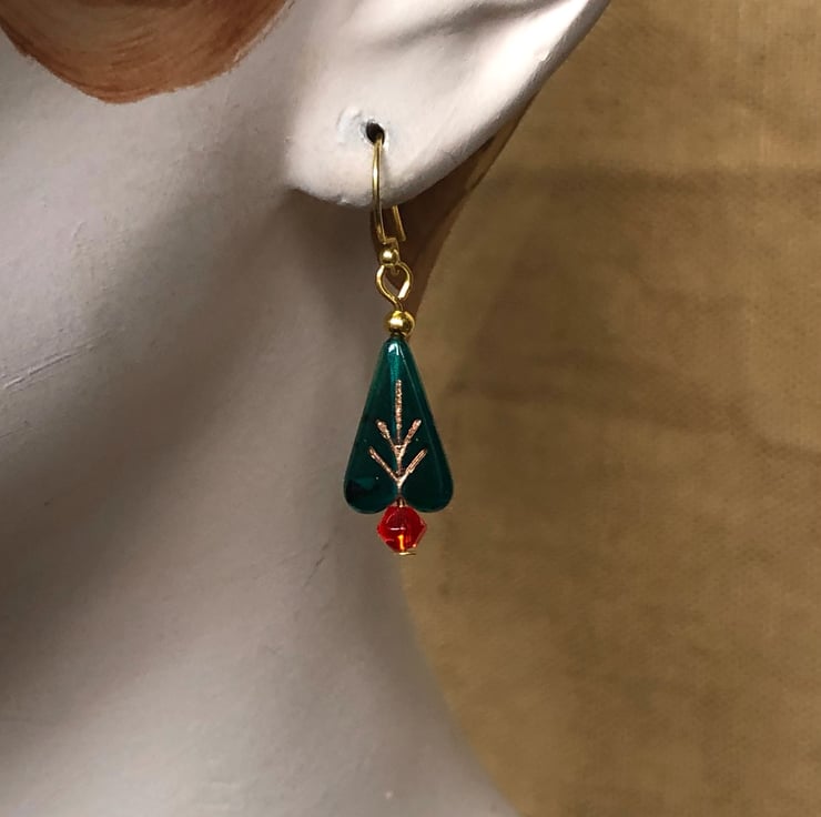 Lovely little lightweight Christmas Tree earrings with semi translucent dark green Czech glass beads for the tree and little red smooth bicones for the pot.
