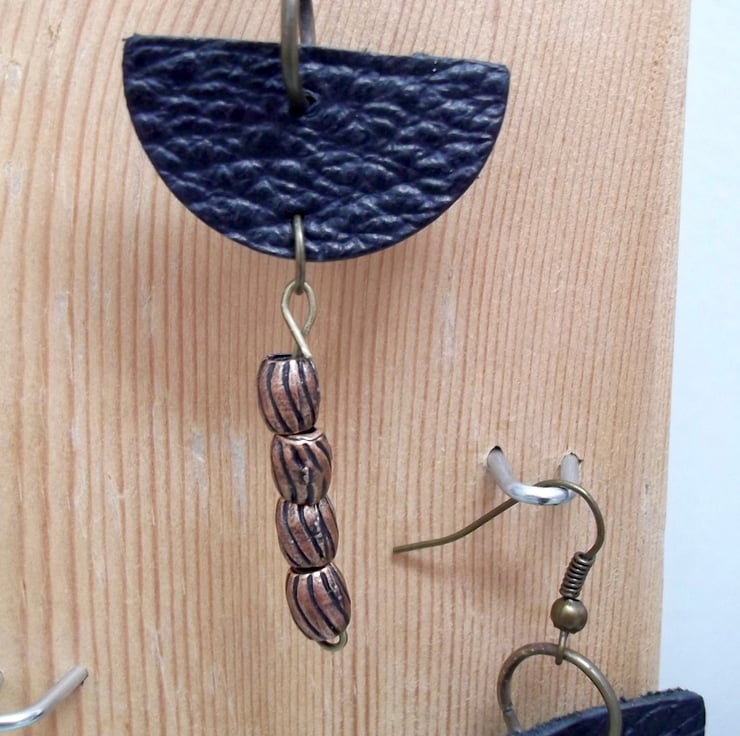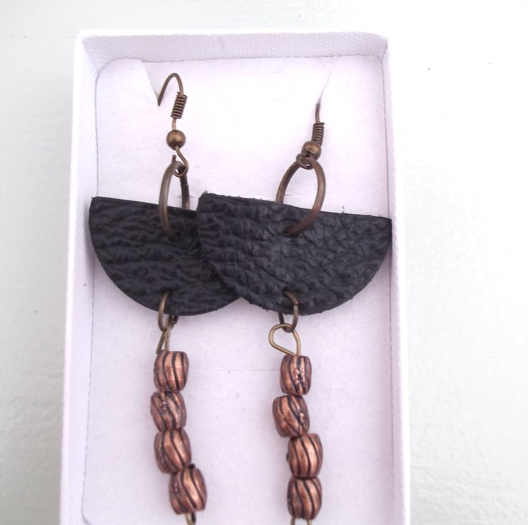 Black Leather Half Moon and Copper Coloured Metal Bead Boho Earrings