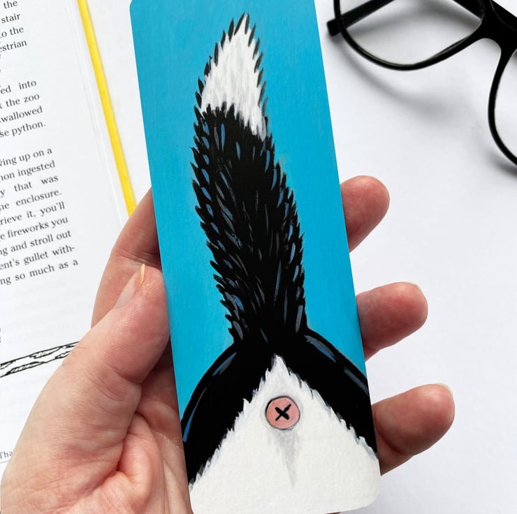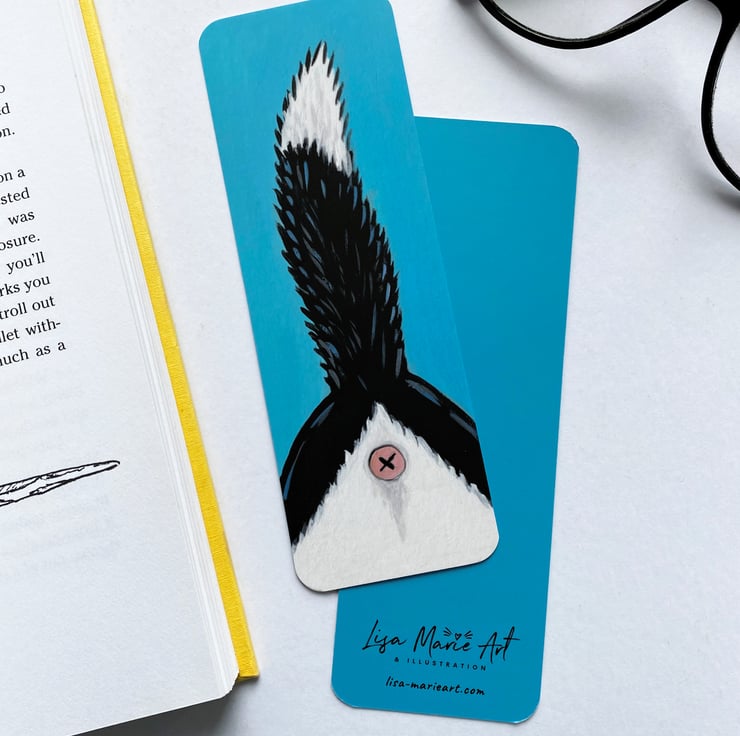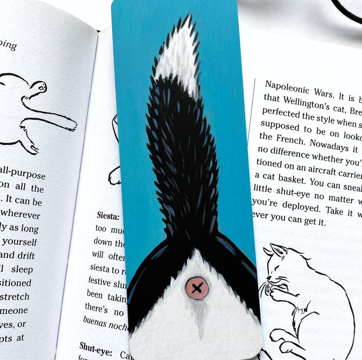 Tail up and no shame! This Tuxedo Cat Bum Bookmark captures that classic feline attitude with a light-hearted twist. Featuring a bold black-and-white cat with a white-tipped tail and a bright blue background, this bookmark is taken from my original hand-painted artwork.
