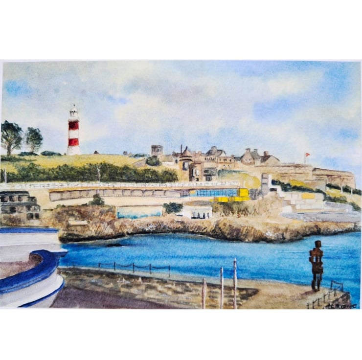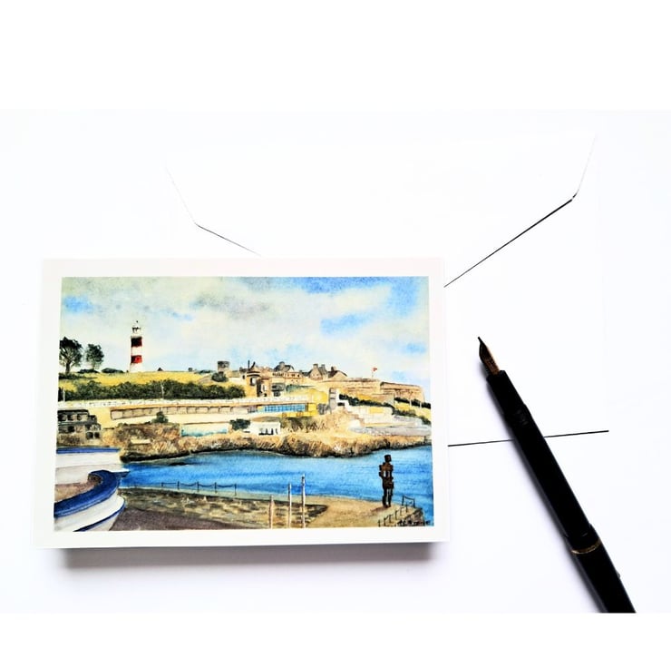 A professionally produced greetings card printed from my original watercolour painting of Plymouth Hoe, featuring Smeaton's Tower lighthouse. .