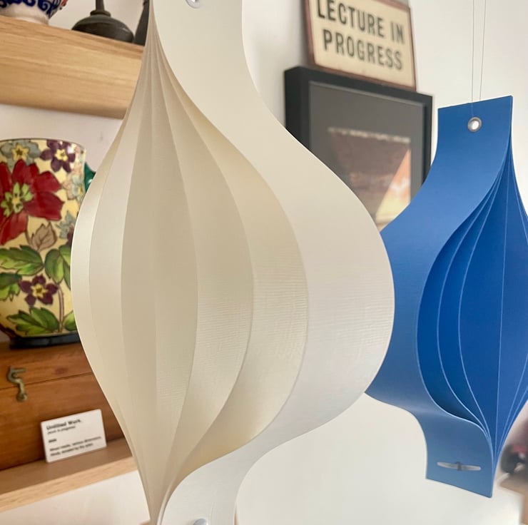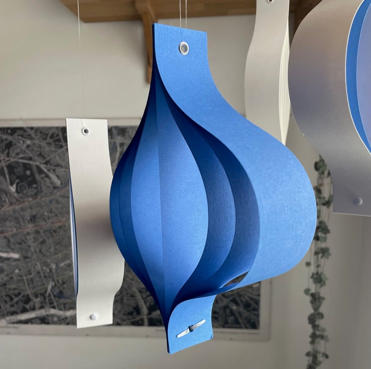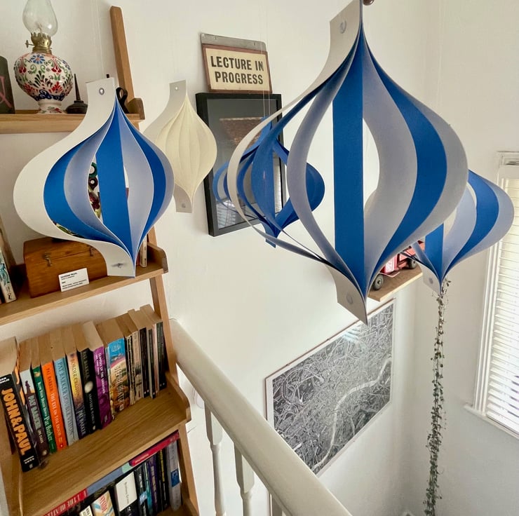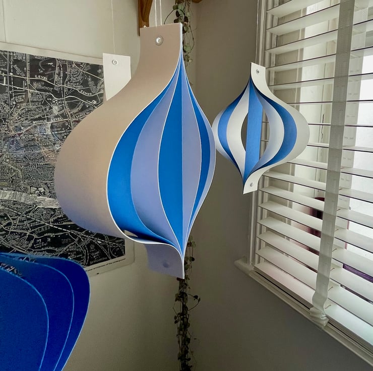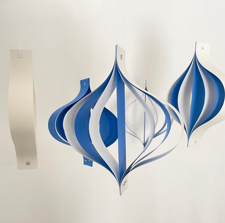 A set of five large hanging ornaments, formed in a mid-century 'oinion' style from strips of high quality craft card. The ornaments are riveted at the top with a metal hole, for ease of hanging. At the base they are fastened together with a brad.