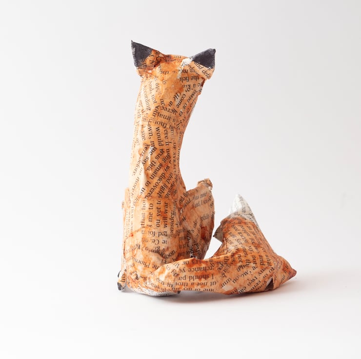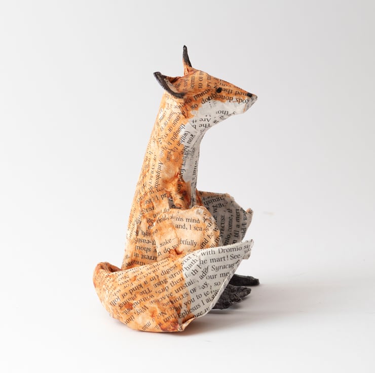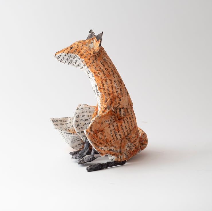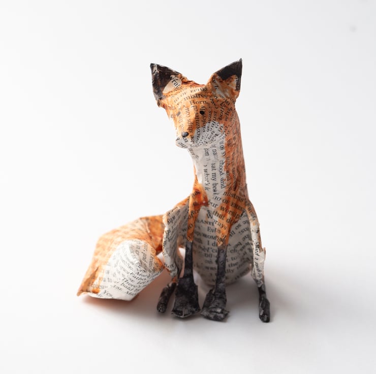 A handmade paper mache folk art sculpture of a sitting fox. It is created from paper mache using book paper, wire and watercolour and is approx 9.5cm high. Made with newspaper, wire, glue, pages from Shakespeare, and watercolour paint.