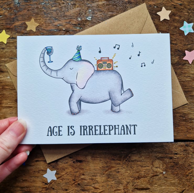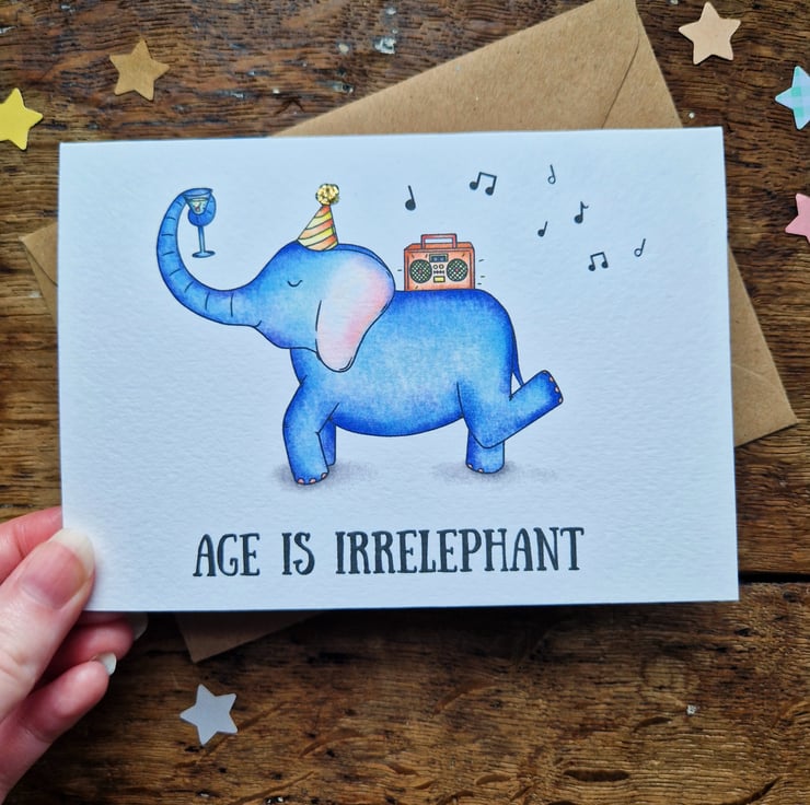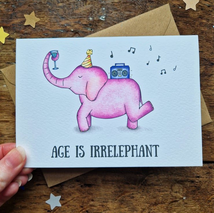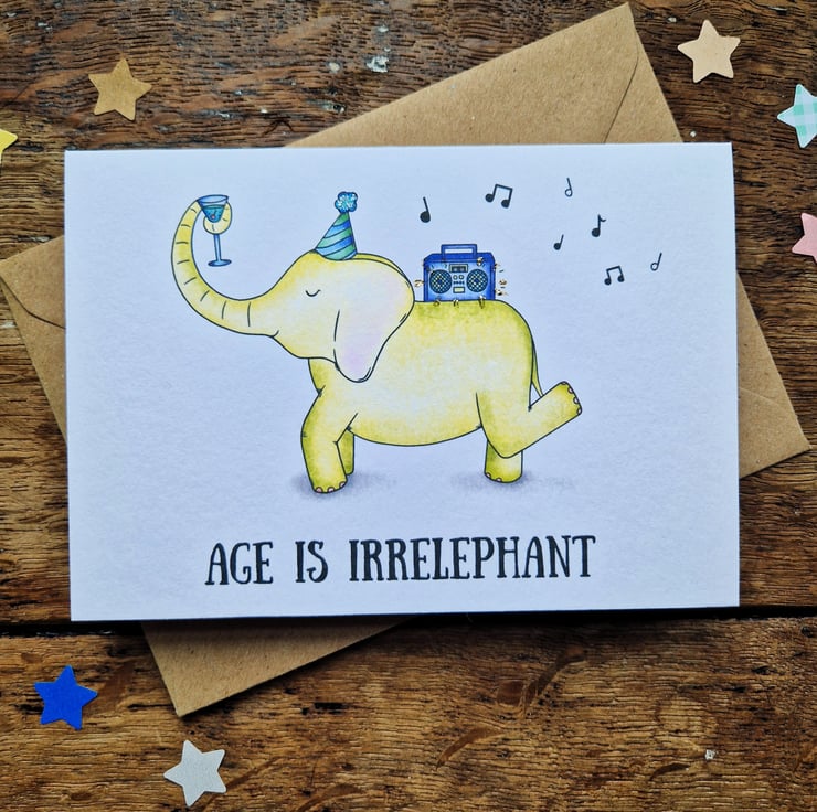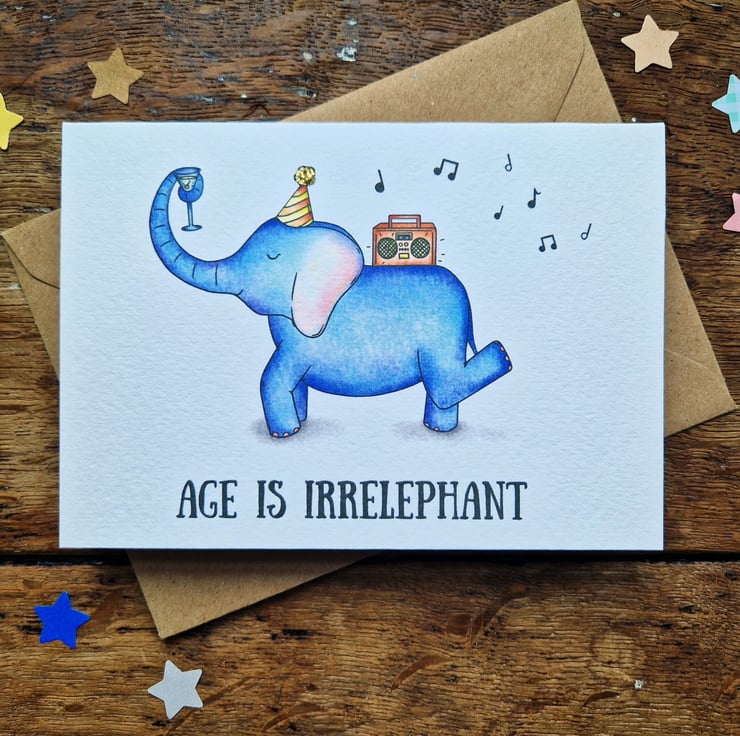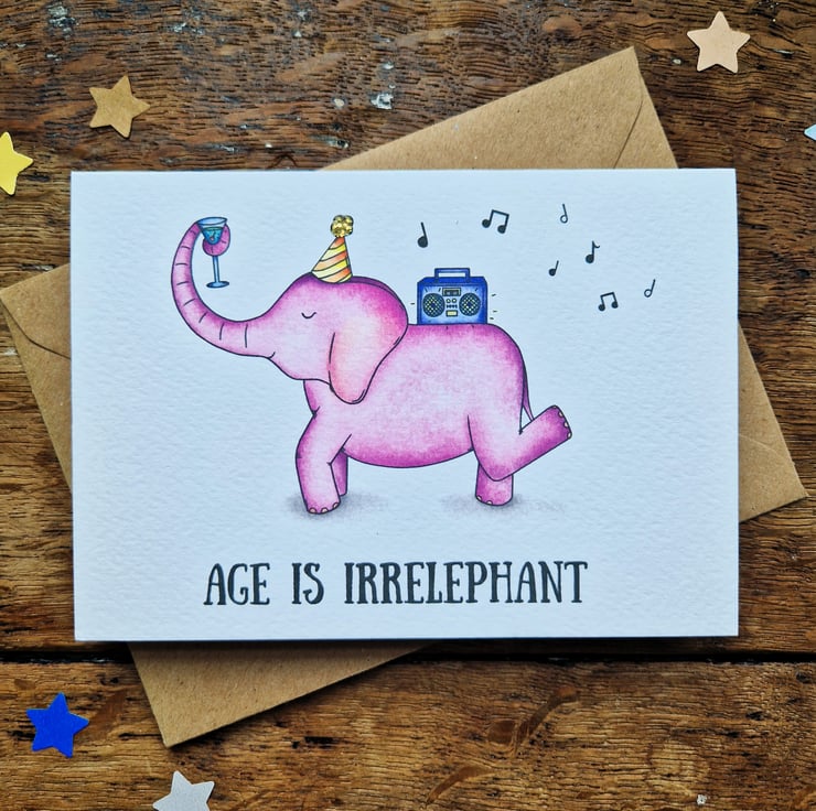 A funny birthday card for friends and family alike! This elephant birthday card comes in four different colours, is handprinted on textured card and glittered by hand.