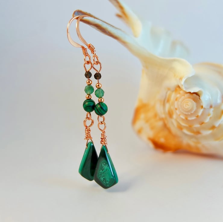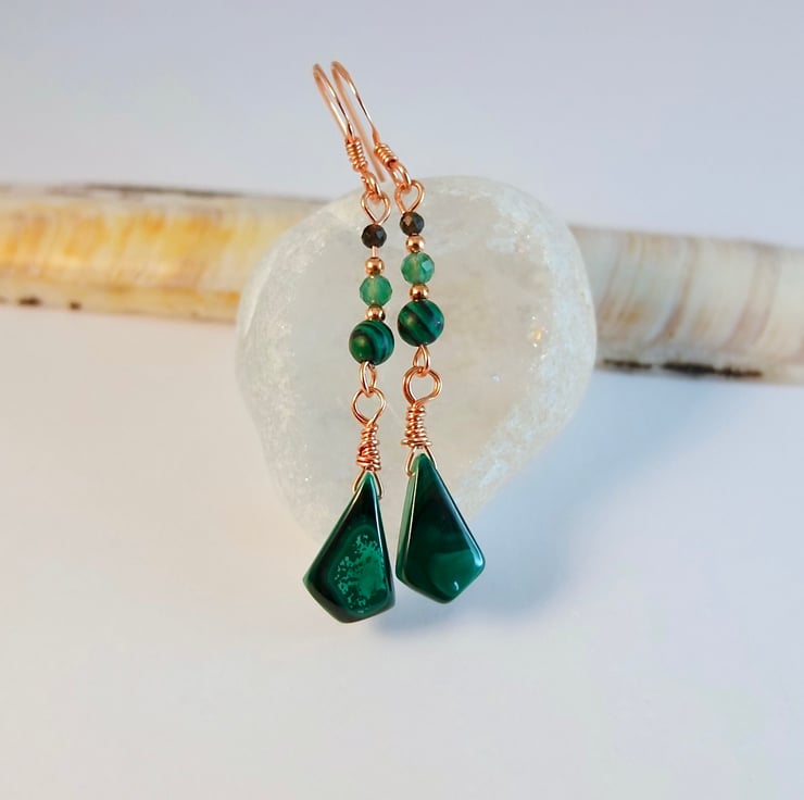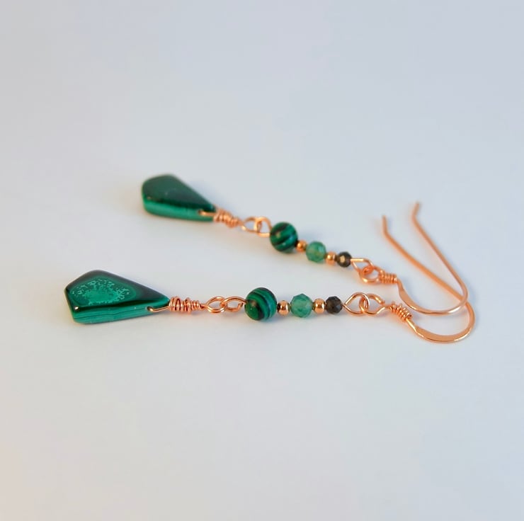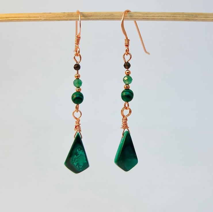 Each striking earring features a 12x8mm Malachite tie shaped focal stone, topped with a 4mm Malachite bead, 3mm faceted Green Onyx and 2mm faceted Obsidian beads, highlighted with 2mm copper spacers.