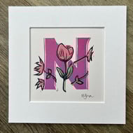 Original, handmade, small multi block lino print of a letter “N” entwined by plants and a central peony. Printed using oil based safe wash Cranfield inks, on quality relief printing paper using a Woodzilla press.