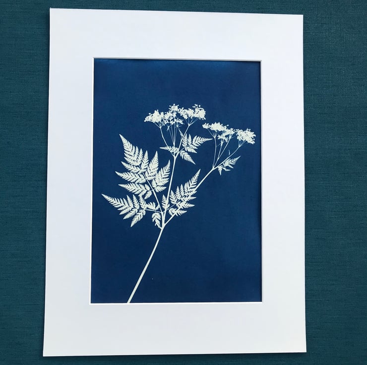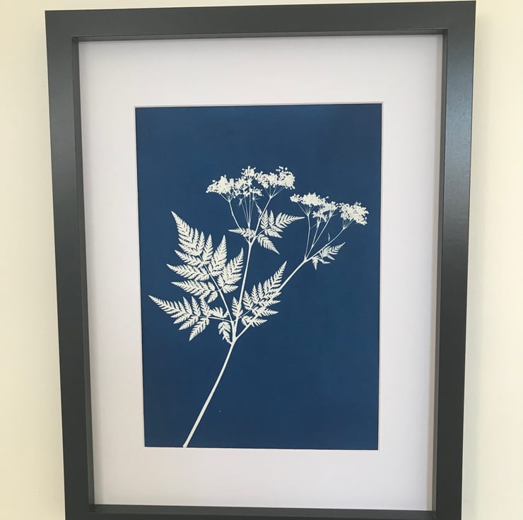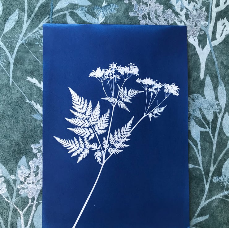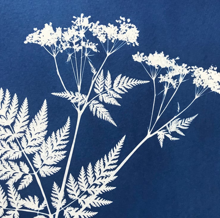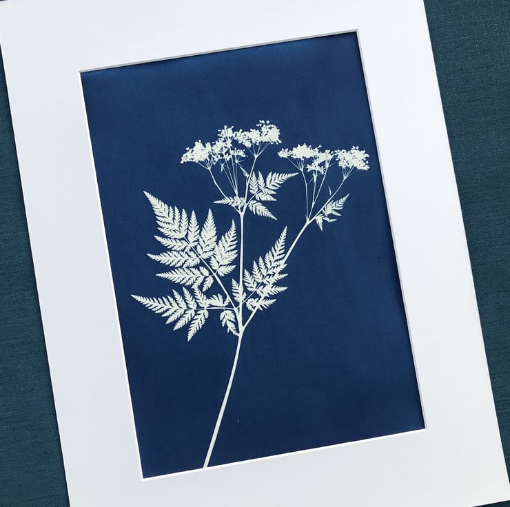 Botanical Art-Frothy heads of cow parsley can be seen in hedgerows in early summer. It's quintessentially a hedgerow staple, bobbing around in the breeze. The flowers and leaves both press well, making it a perfect plant for Cyanotype. Detailed cut-edged leaves and soft flower umbels off spiky stalks show off in fresh white, against the Prussian blue background. It would make a lovely gift for someone special.
