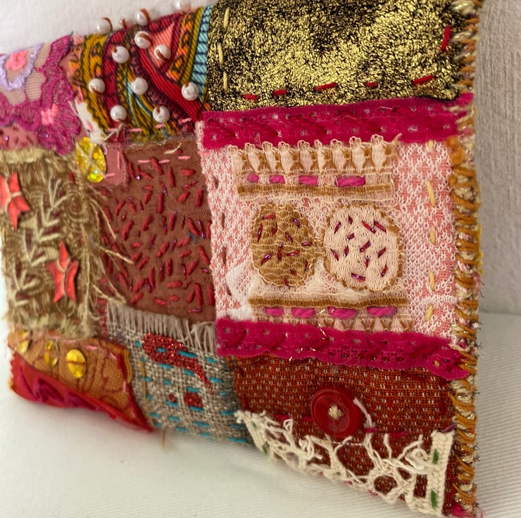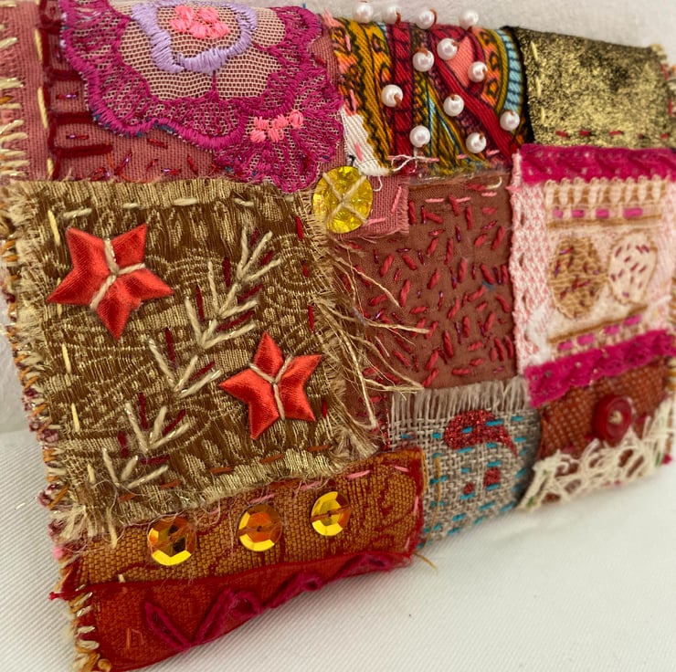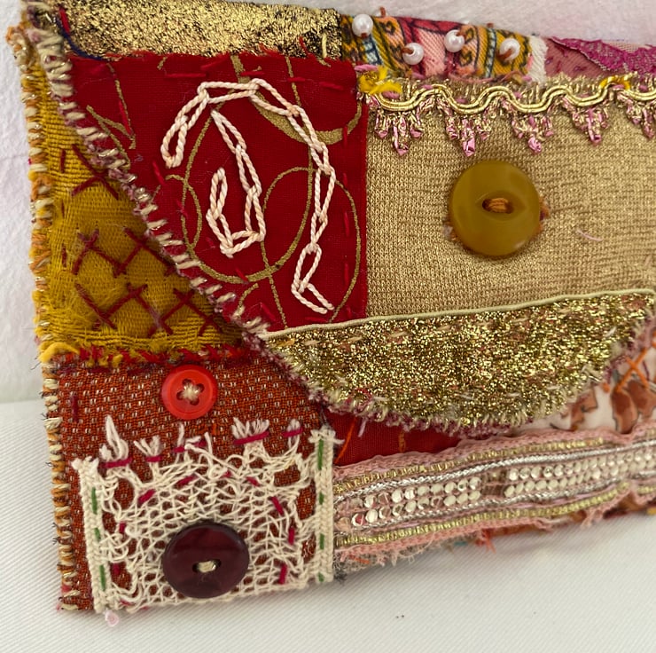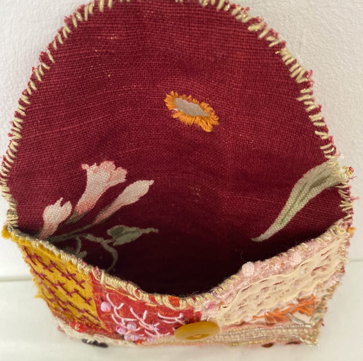 I Love the Bohemian style which is the inspiration for this small purse made from repurposed fabrics hand stitched with added embellishments button fasten. measuring 6 x 4 inches approx