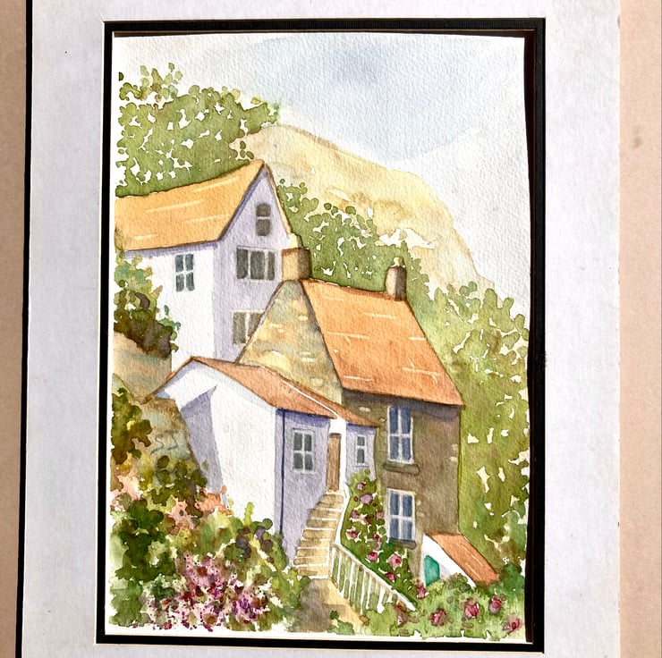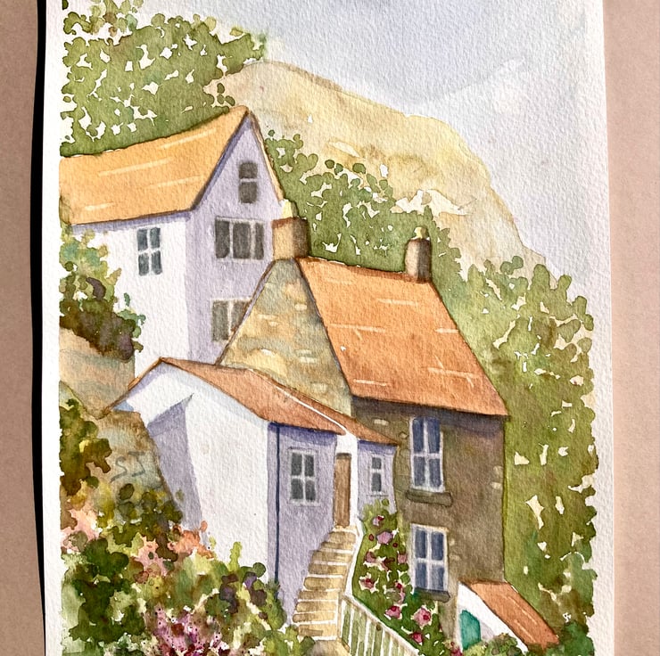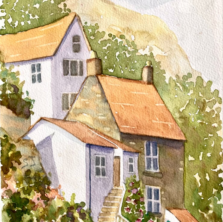This colourful watercolour is a splash of colour for any Neutral decor. This pretty farmhouse is typical to houses on the North Yorkshire coast with its burnt orange roofs.