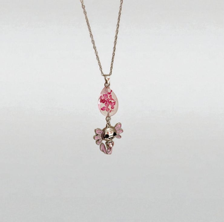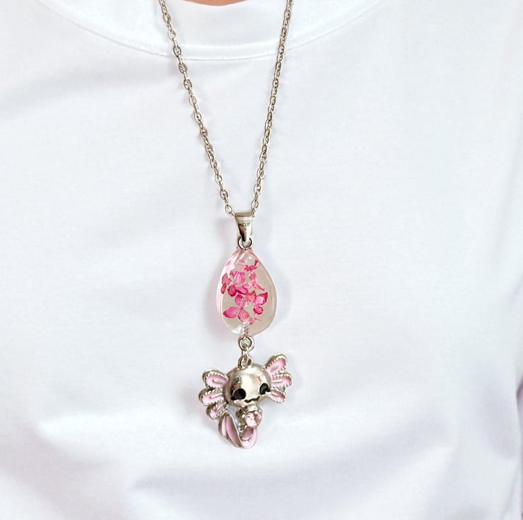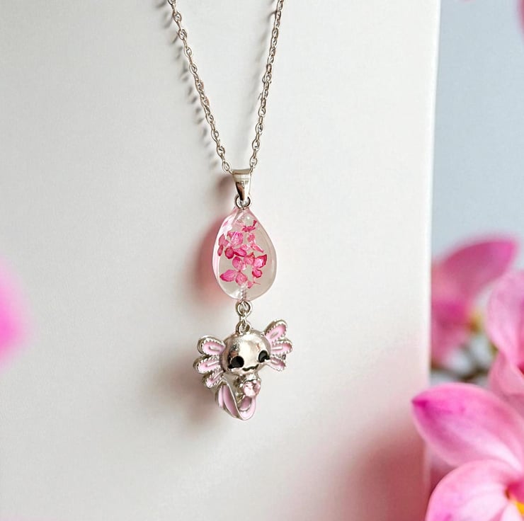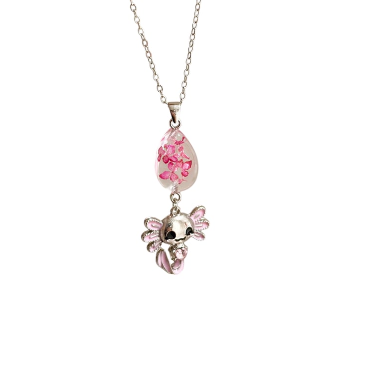 Delicate, playful, and full of charm — this unique pendant features a sterling silver axolotl with soft pink enamel details, paired with a beautiful resin teardrop charm filled with real pressed pink flowers. A sweet blend of nature and whimsy, perfect for anyone who loves rare creatures and botanical beauty.