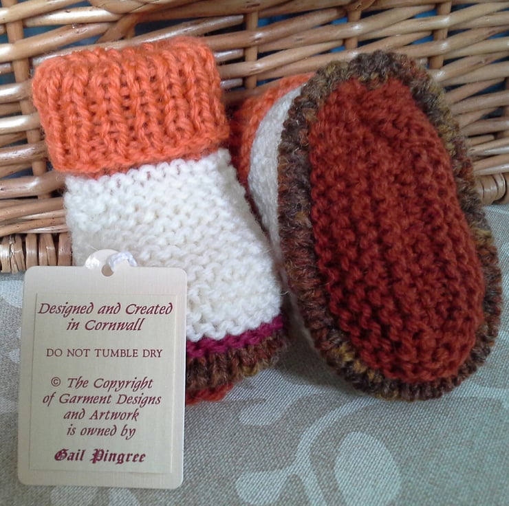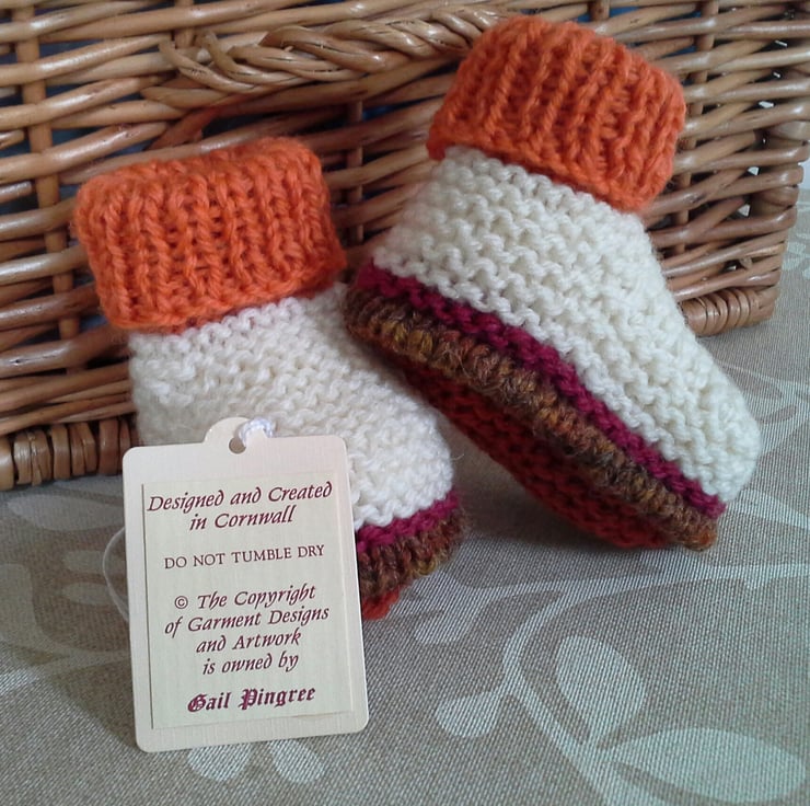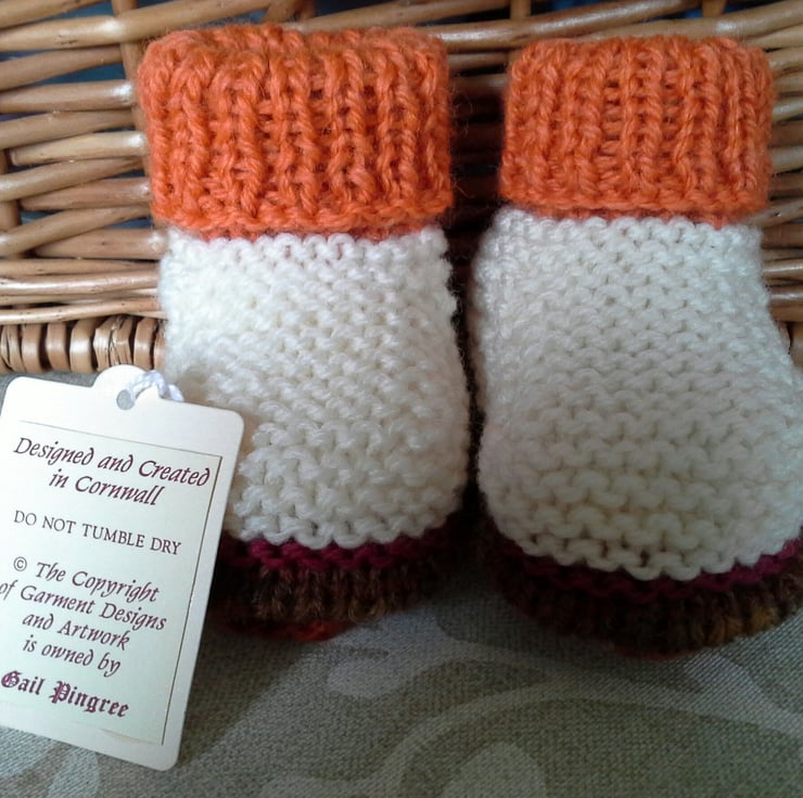 These booties are a genuine designer product. They have not been reproduced from any commercially published knitting pattern. Please respect the designer's full time profession, skills and modest income for hours of quality workmanship by not trying to replicate them, including using different colourways,yarns and trims.