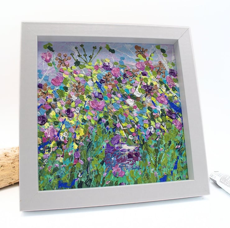 This is a framed textured landscape. I have used layers of professional-quality acrylics mixed with water-based cold wax to add depth and interest to this rural scene. I have applied the paint mix using a variety of painting knives, twigs and my own hands. Some key features include: