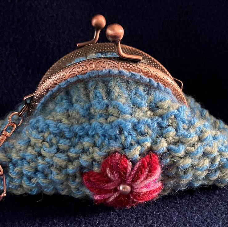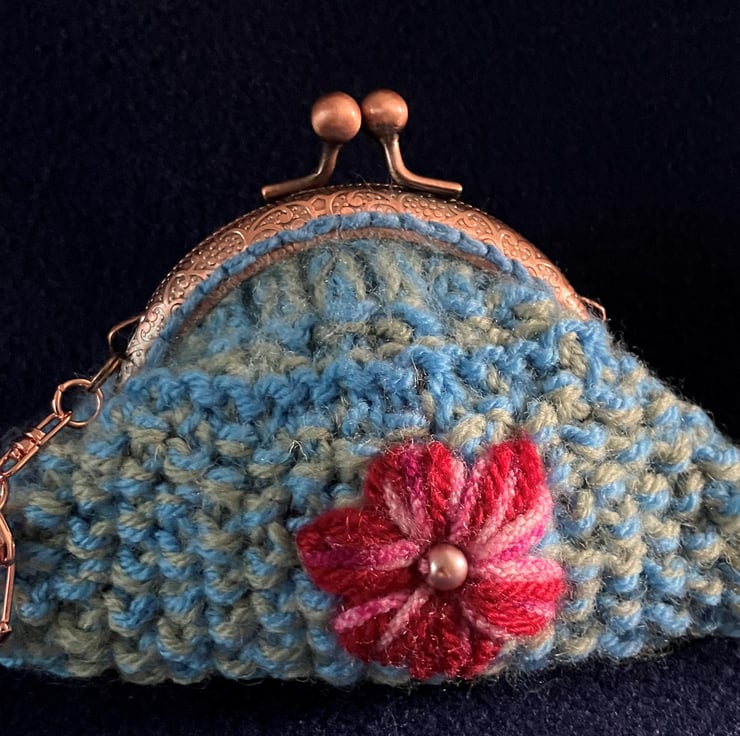 This purse has a centre bead, metal click shut clasp and a metal clip.