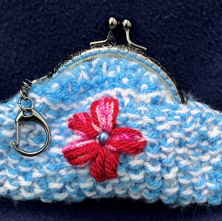 This purse has a centre bead, metal click shut clasp and a metal clip.