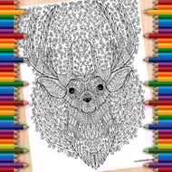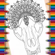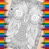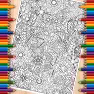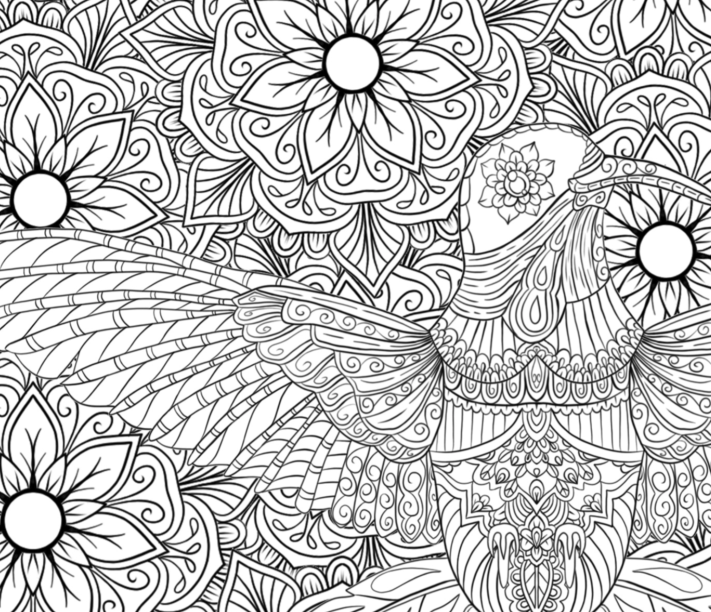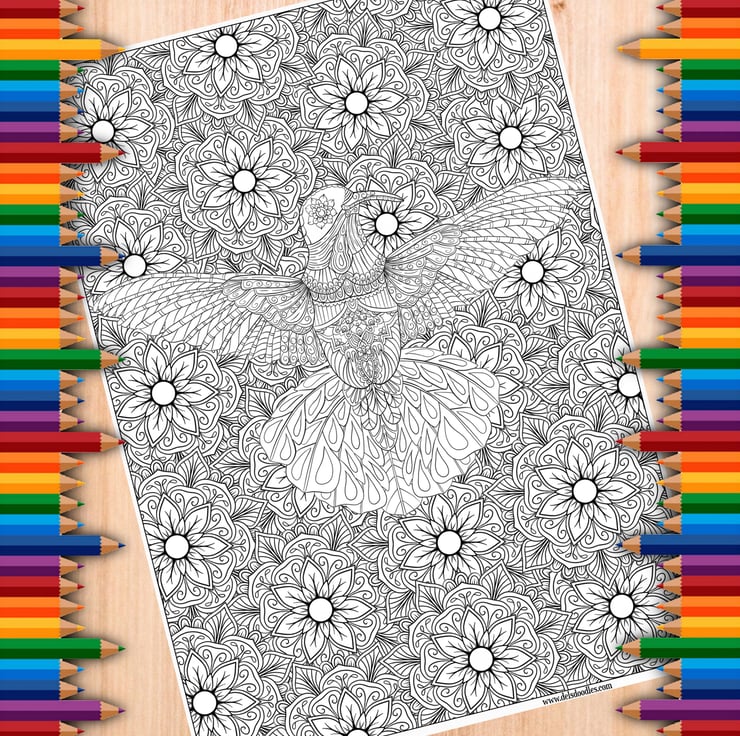 A digital, printable PDF of an illustrated hummingbird surrounded by flowers, in high resolution for colouring.