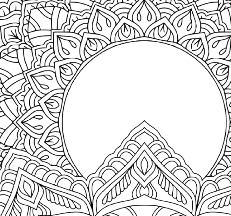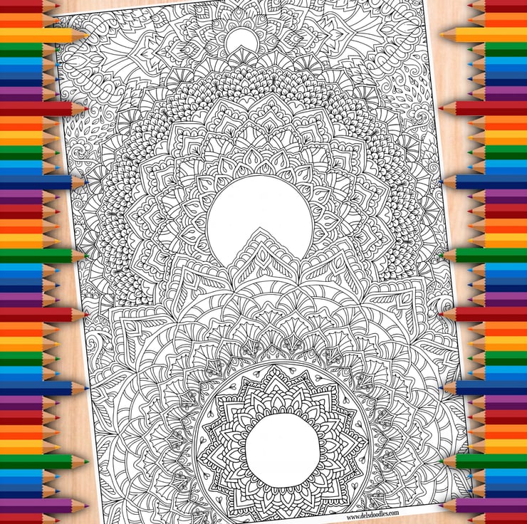 A digital, printable PDF of two ornate, intricate mandalas stacked to fill the page, in high resolution for colouring.
