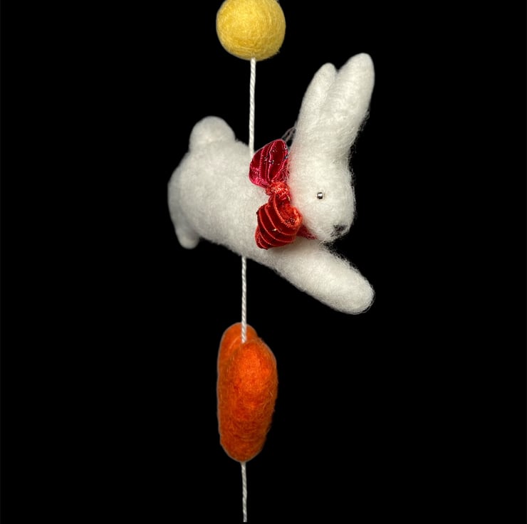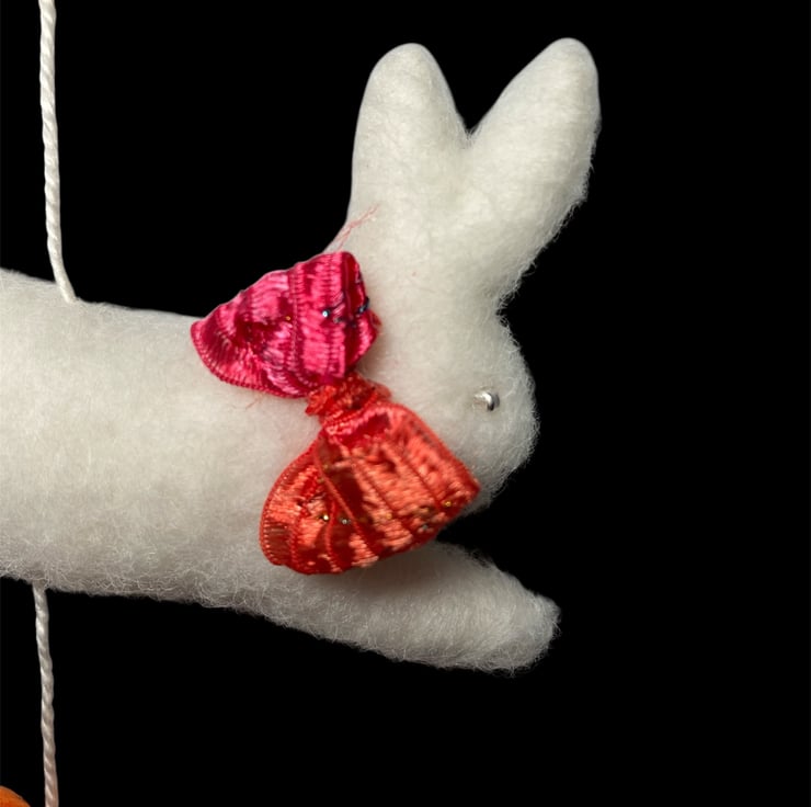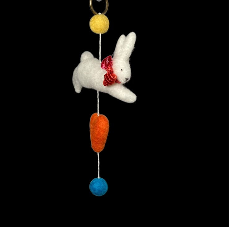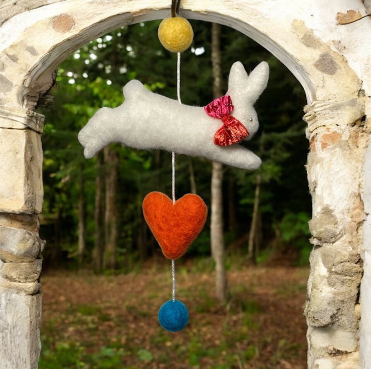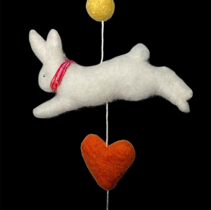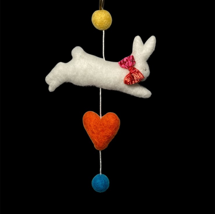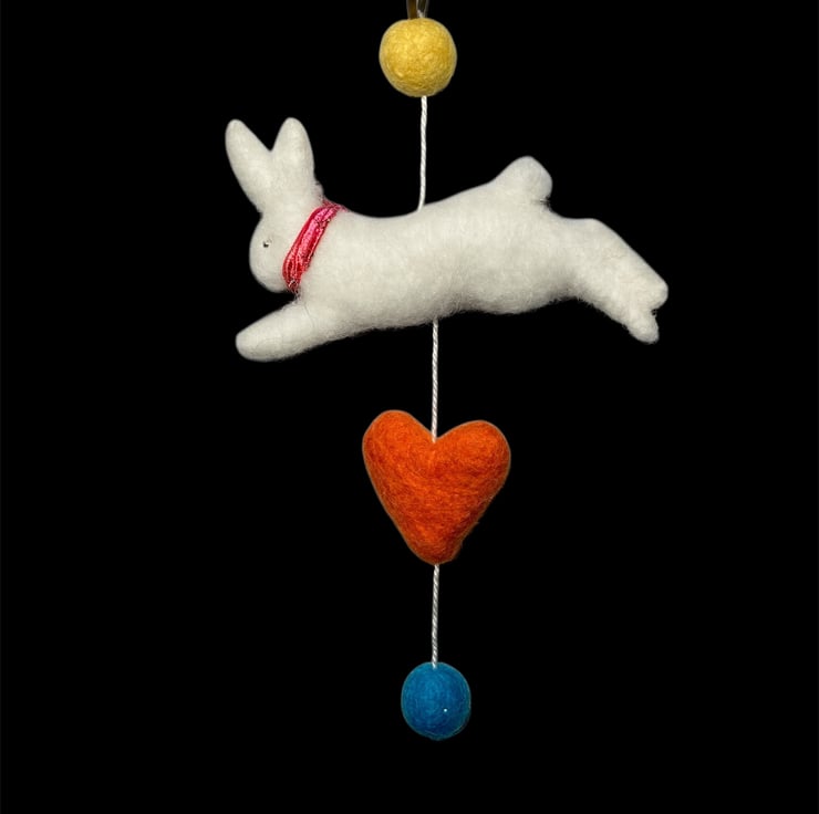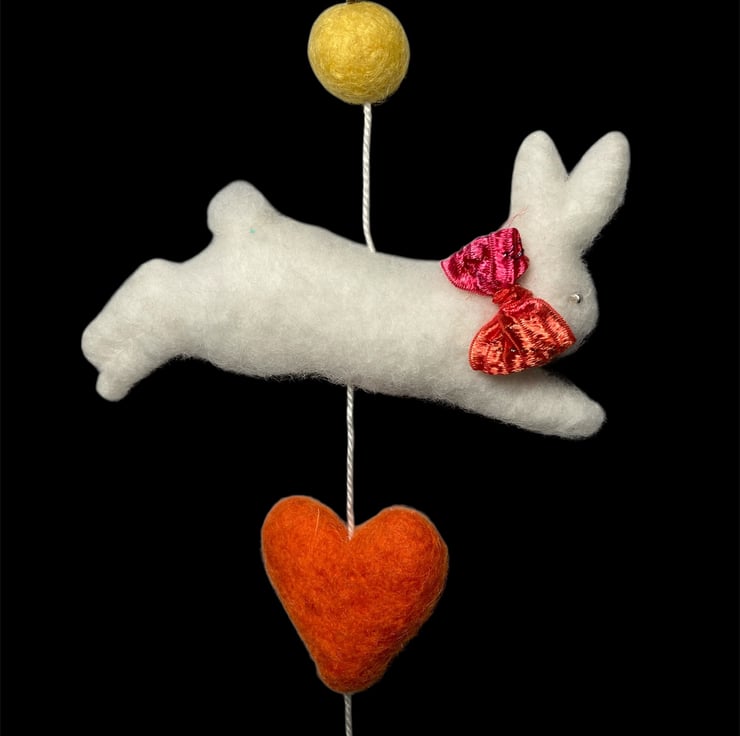 An adorable felted white leaping bunny suspended on white cotton thread along with felt ballts and a felt heart. This decoration is suitable for hanging on a wall or suspending from the ceiling. The felted white bunny measures approximately 10cm wide and is lightly stuffed to create a 3d effect. The bunny has a sparkly red bow around his neck and silver coloured beaded eyes. A brass ring has been added to the top of the decoration to facilitate hanging. The decoration can be hung on the wall or suspended allowing it to turn in the breeze. if hung over a cot, please hang out of reach of young baby.