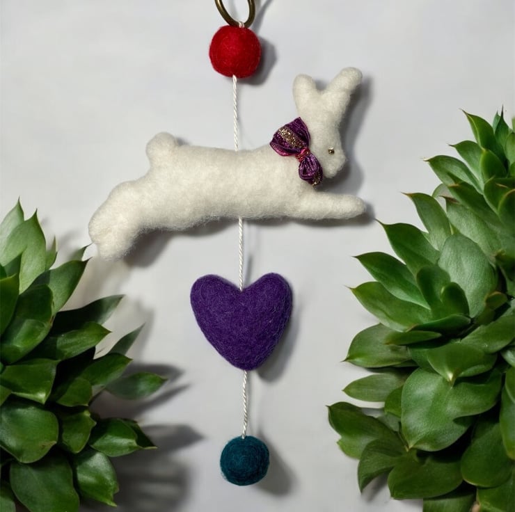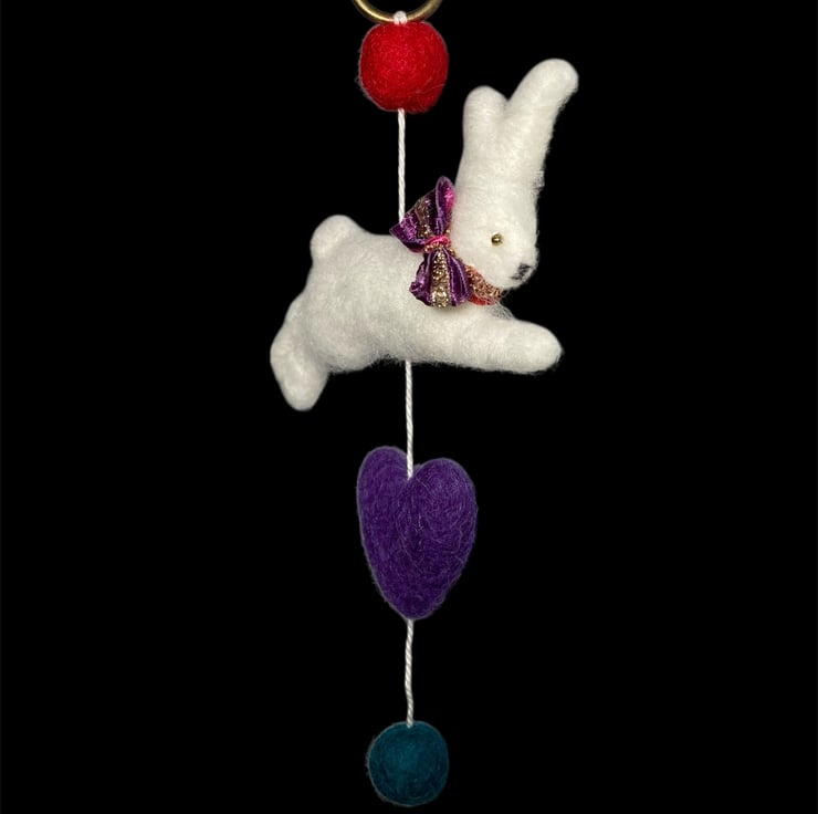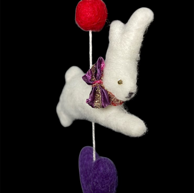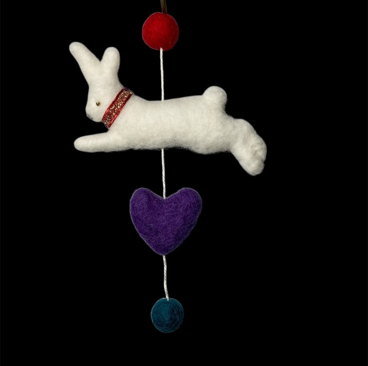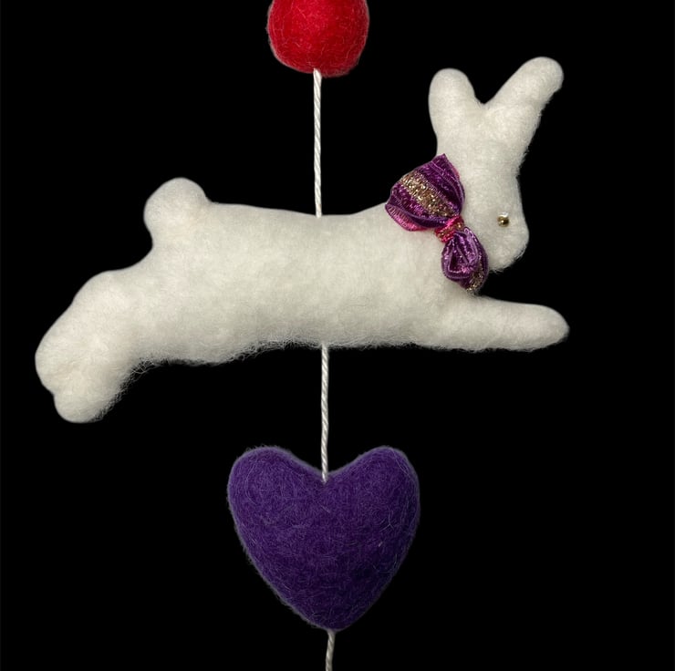 This sweet felted white leaping bunny is suspended on white cotton thread along with coloured felt balls and a felt heart. The decoration is suitable for hanging on a wall or suspending from the ceiling. The felted white bunny measures approximately 10cm wide and is lightly stuffed to create a 3d effect. The bunny has a sparkly purple/pink bow around his neck and gold coloured beaded eyes. A brass ring has been added to the top of the decoration to facilitate hanging. The decoration can be hung on the wall or suspended allowing it to turn in the breeze. if hung over a cot, please hang out of reach of young baby.