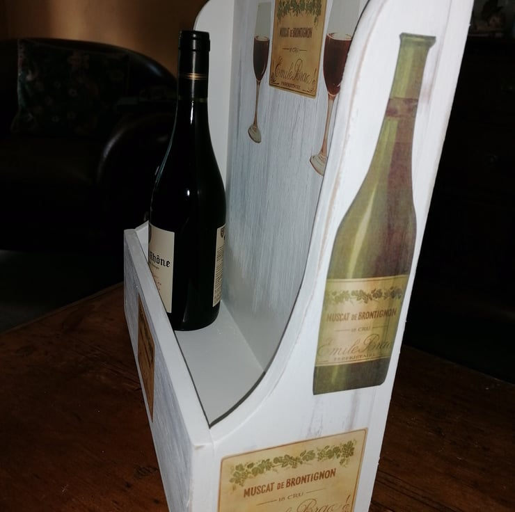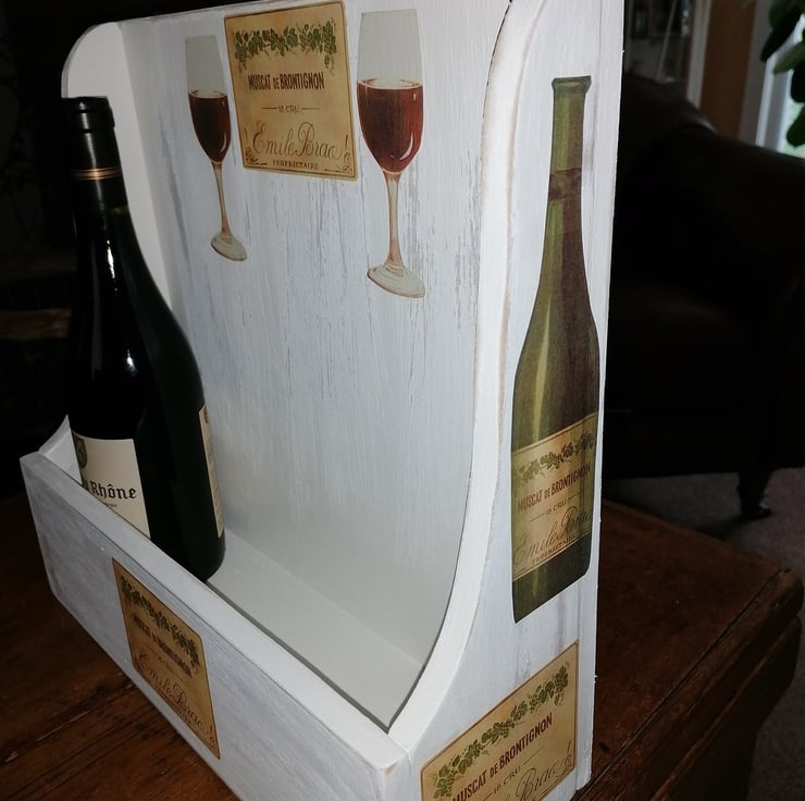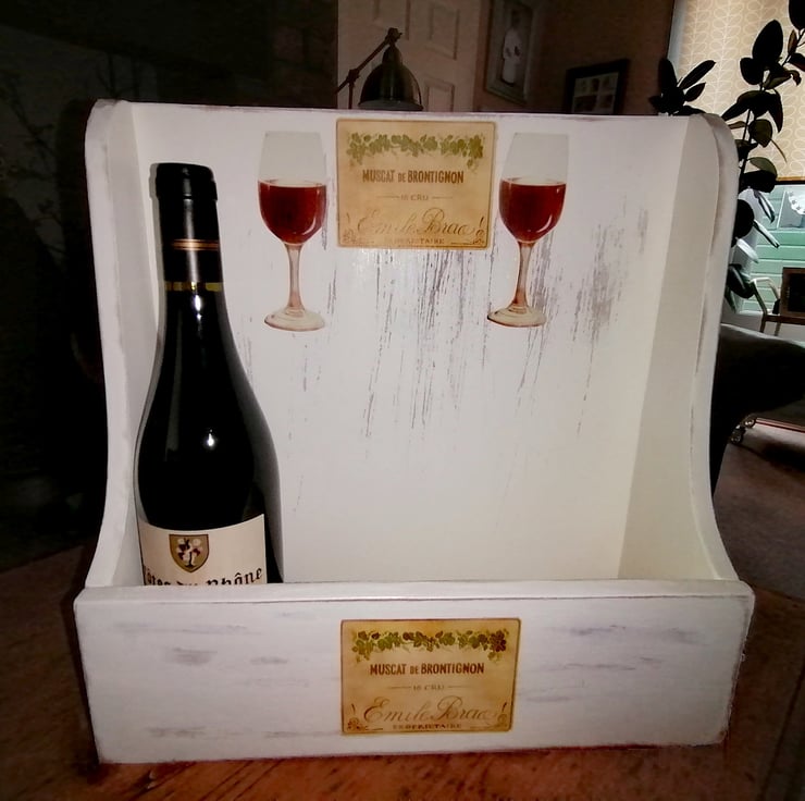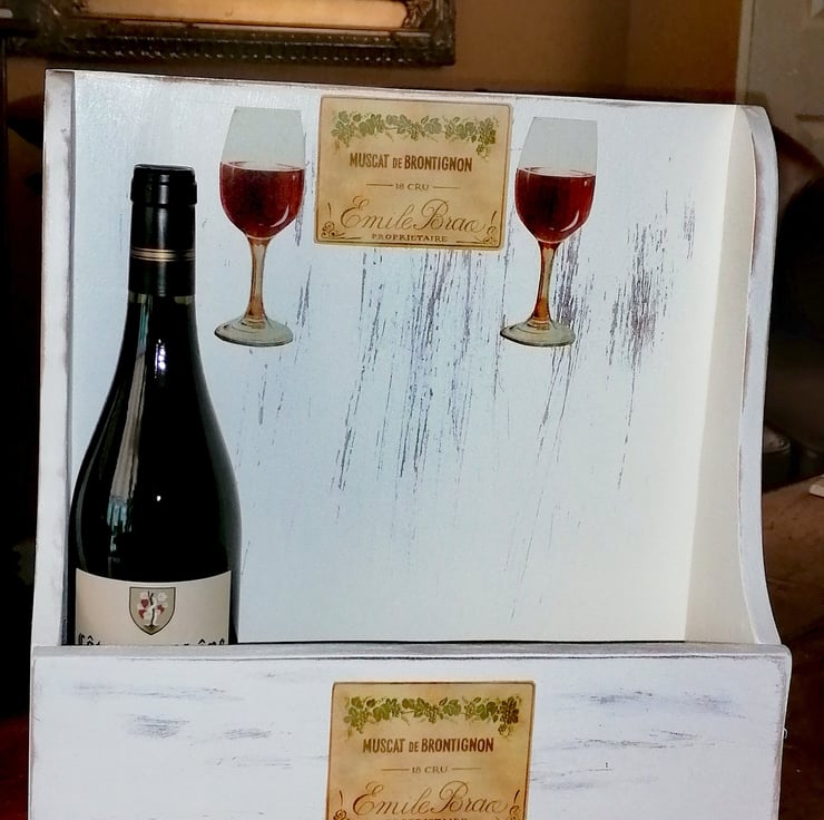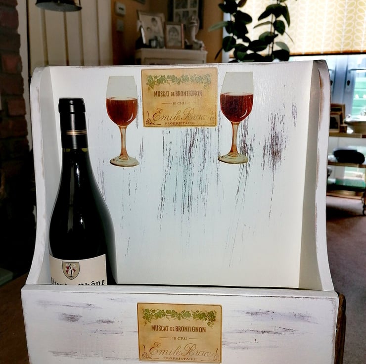 Painted in Farrow & Ball House White, distressed then decorated in vintage wine embellishments...