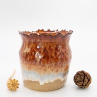 Made with chocolate speckled clay and finished with two-tone white and clear glossy glaze.