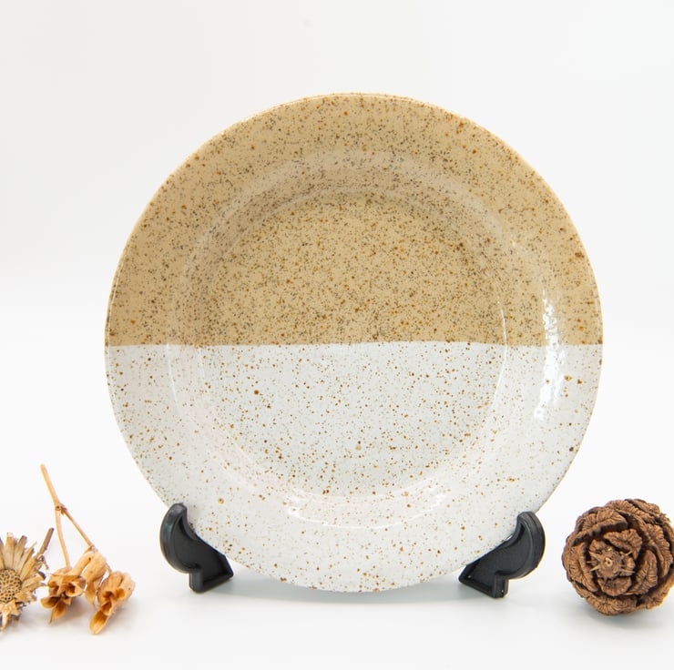 Made with chocolate speckled clay and finished with two-tone white and clear glossy glaze.
