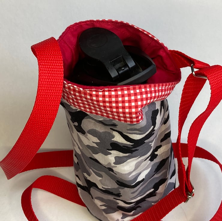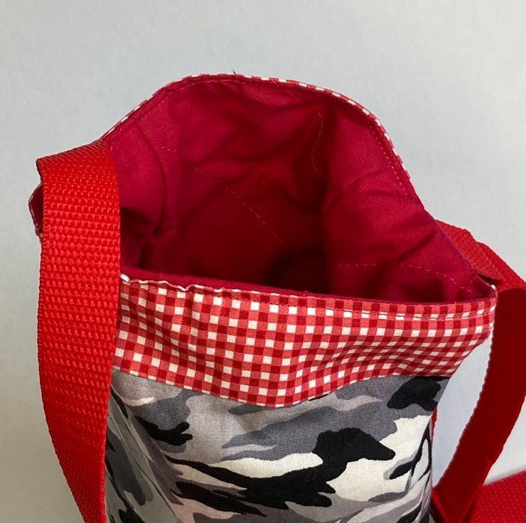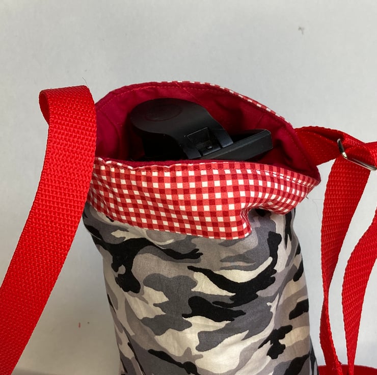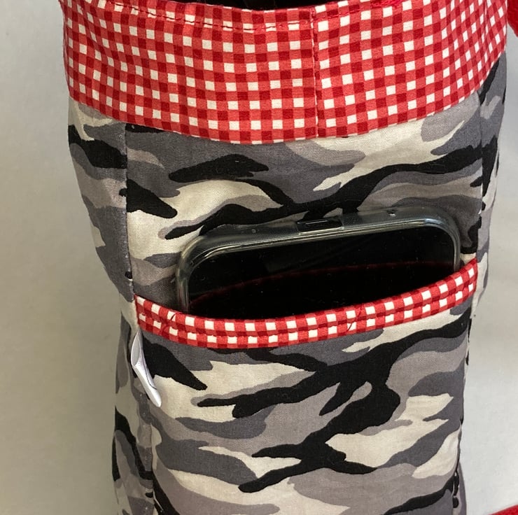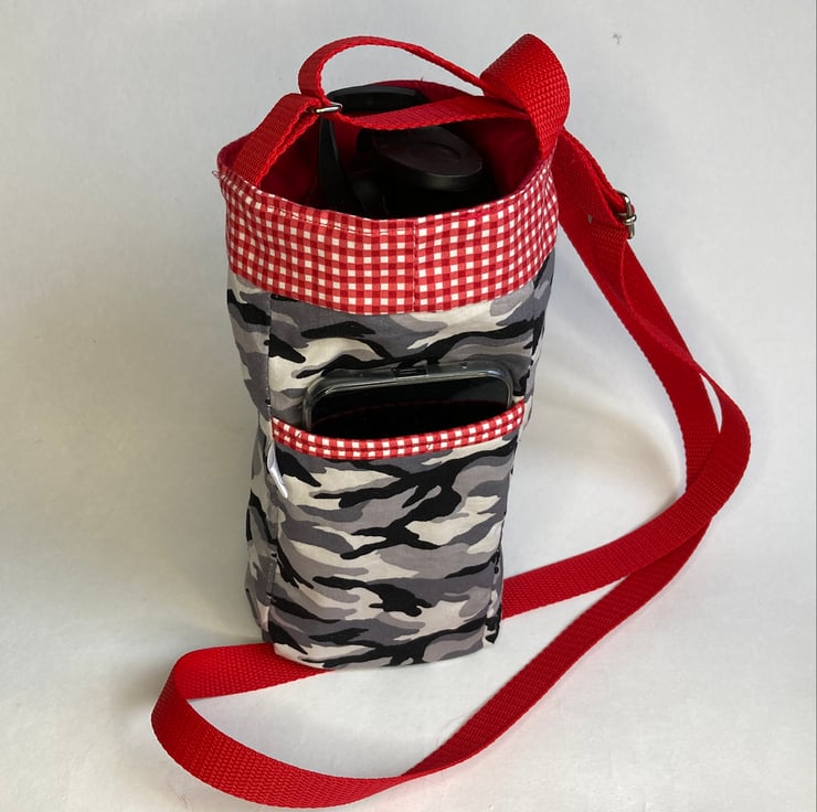 The outside of this bag is made from grey camouflage fabric. The trim is red check and the lining is plain red and the strap is also red. Laid flat, the bag measures 16cm across and 22cm deep. It will easily transport most drinks bottles or hot drinks cups, but do measure your favourite cup first, just to make sure. The built in pocket, designed to hold your phone, measures 9.5 x16.5cm.
