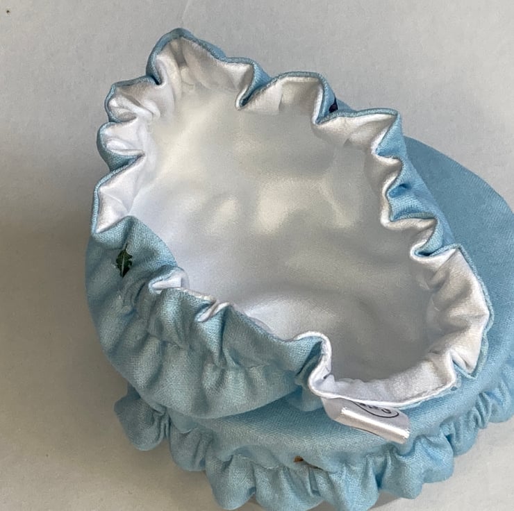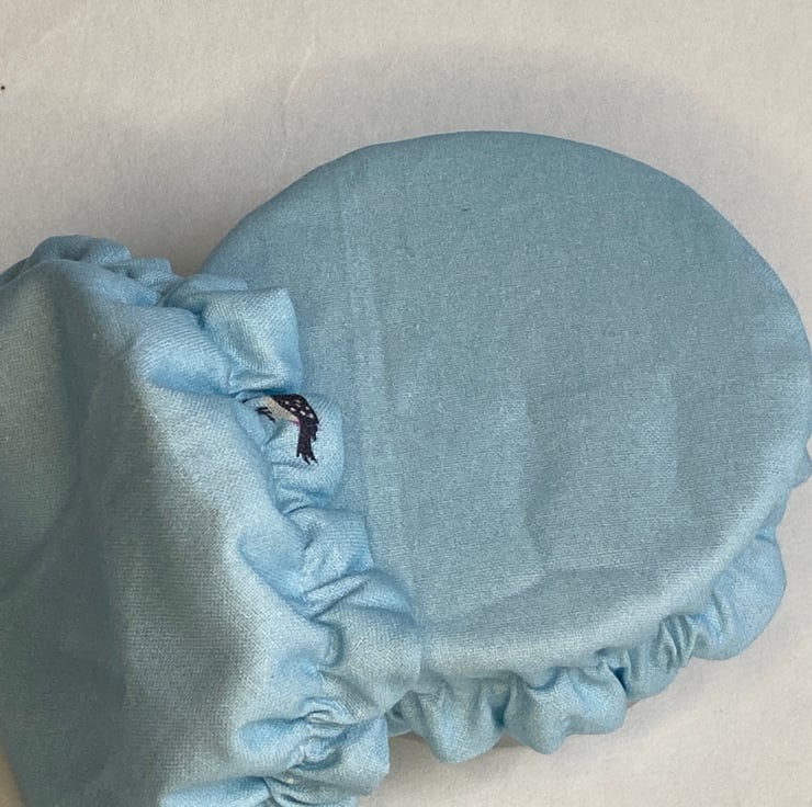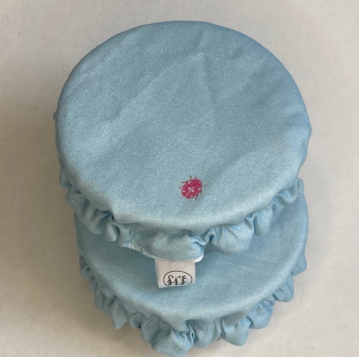 This useful pair of pot covers are made from pale blue cotton. There are some tiny wildlife images on the fabric but these are not very obvious. They are lined with white PUL - a fabric that is laminated with a small amount of plastic. It is safe to be in contact with food, helps to keep it fresh but reduces the need for single-use plastics. An elasticated rim keeps the covers securely in place on your chosen dish or pot. They are washable by hand or machine, making them a hygienic option but often just a wipe with a cloth is enough. I find they are much easier to use than beeswax wraps.