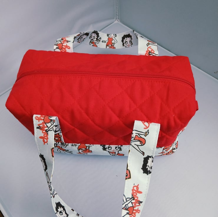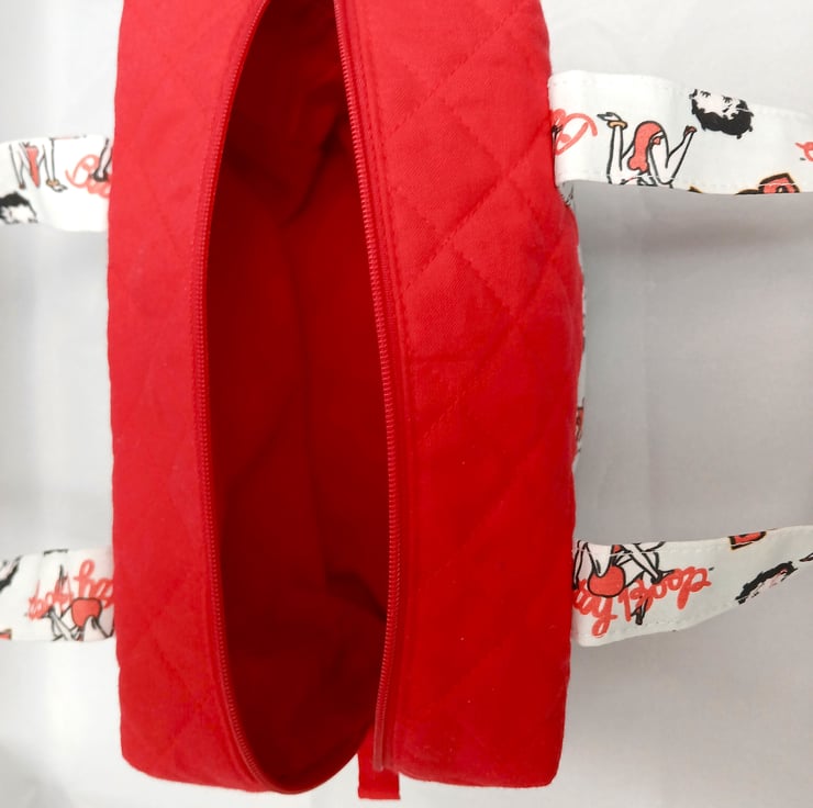 Betty Boop Bag, Quilted, multi purpose. This bag is made from 100% cotton. The bag fabric has wadding and backing fabric, and has been quilted to give structure. Red cotton lining. For those who are into Betty Boop, this is a must have.