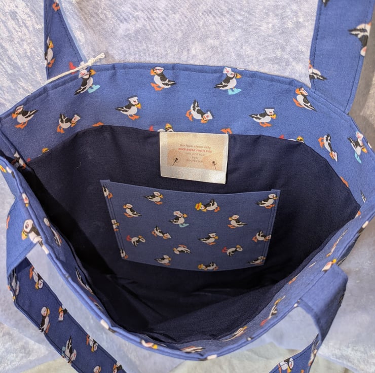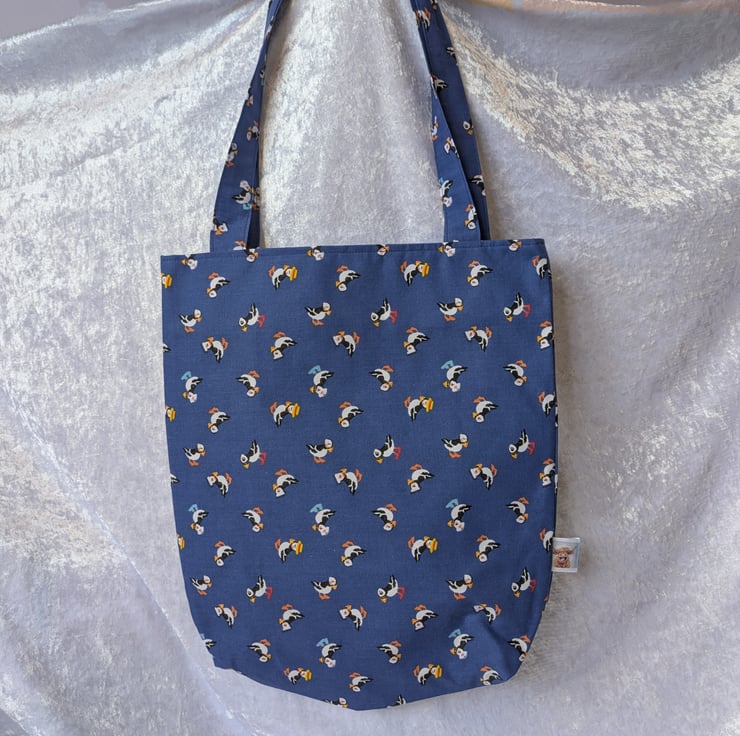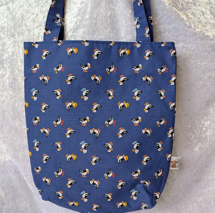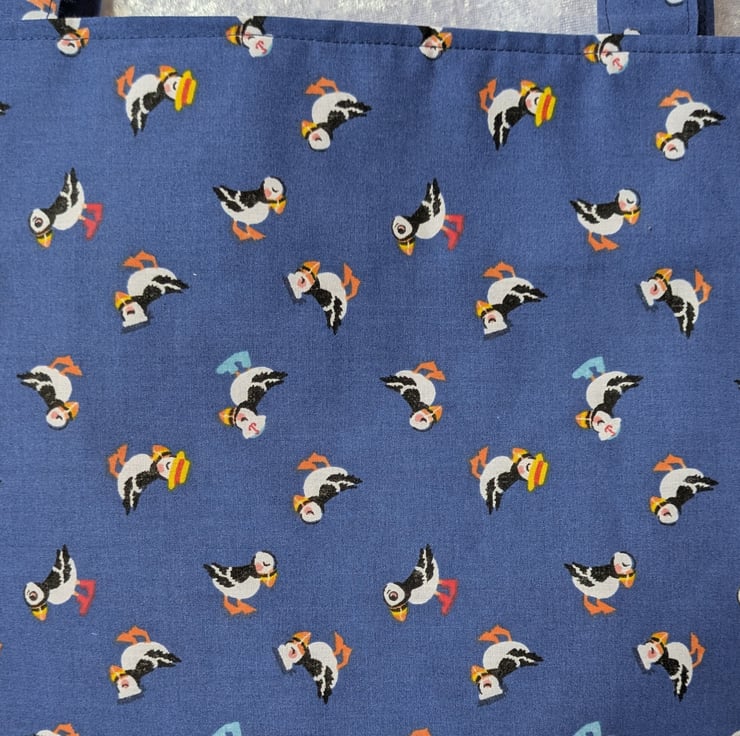 Cute little puffins, some in boots some with hats, on a blue background. This bag is lined and has a pocket inside. The bag measures approximately 31 cm across and 37 cm in height the straps measure 62 cm in length. This is a great shopper bag, or for books or a picnic.