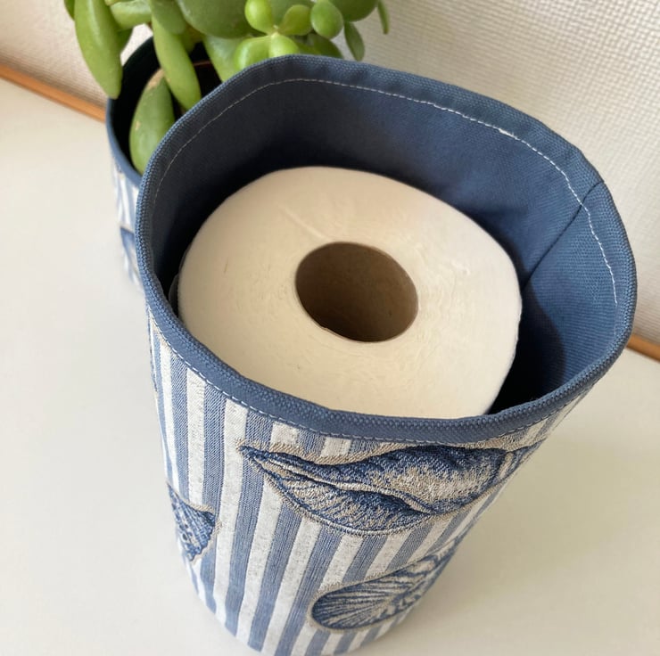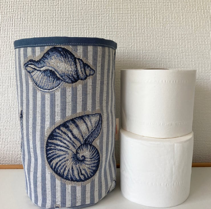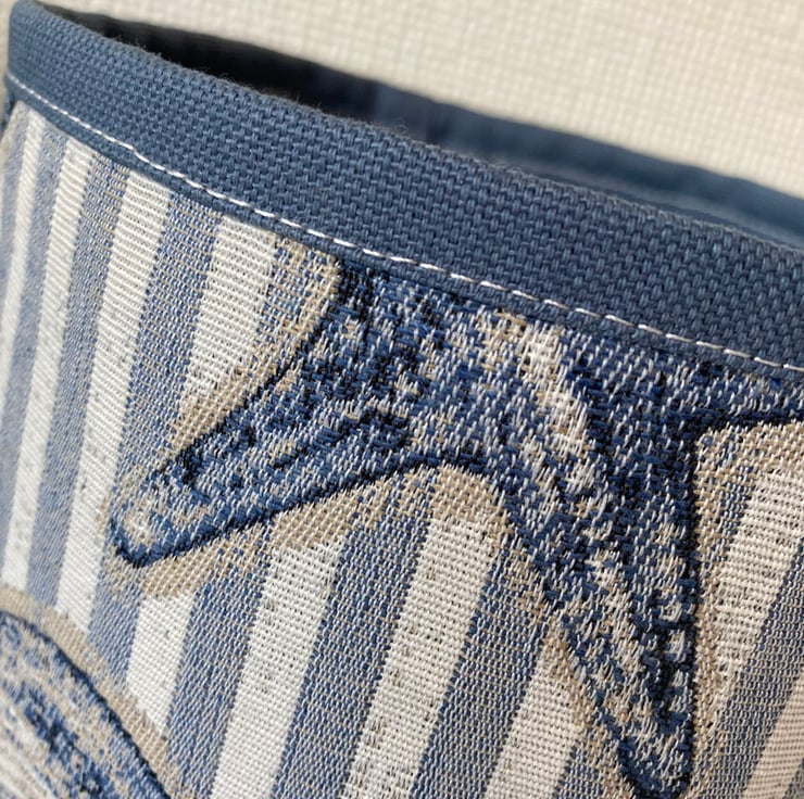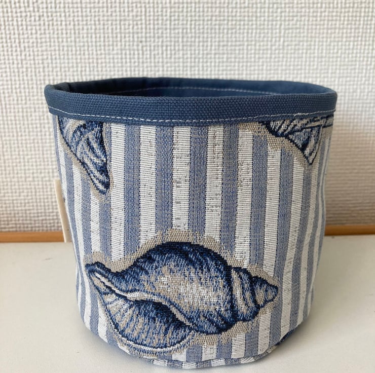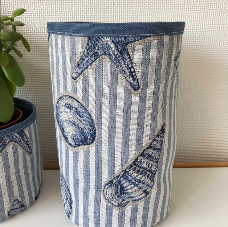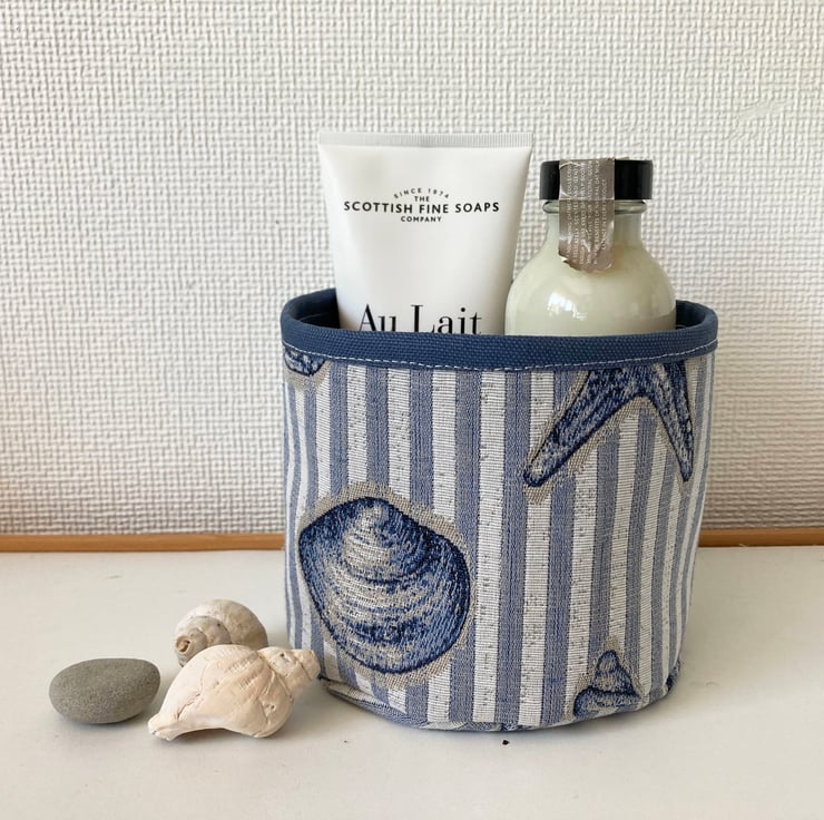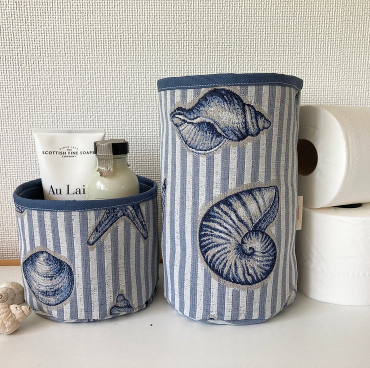 Add a touch of coastal charm to your bathroom with one of these beautiful handmade storage tubs, made with seashell and striped tapestry fabric, and blue plain inner lining fabric.