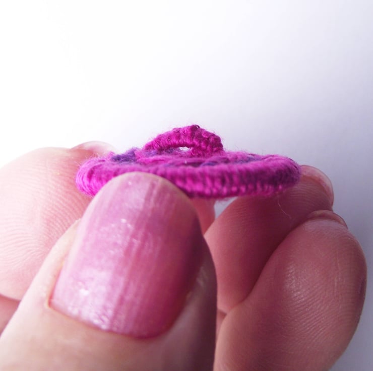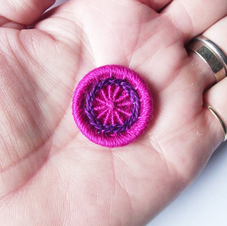 I made these Dorset buttons by working cotton thread around brass rings. The colours are bright orchid pink and purple. I have added integral thread shanks for easy sewing onto your project.