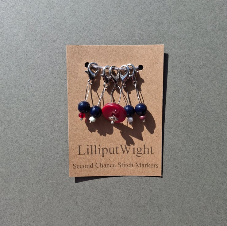 A set of five stitch markers made from broken or unloved jewellery, for use in crochet or as a progress keeper in knitting.